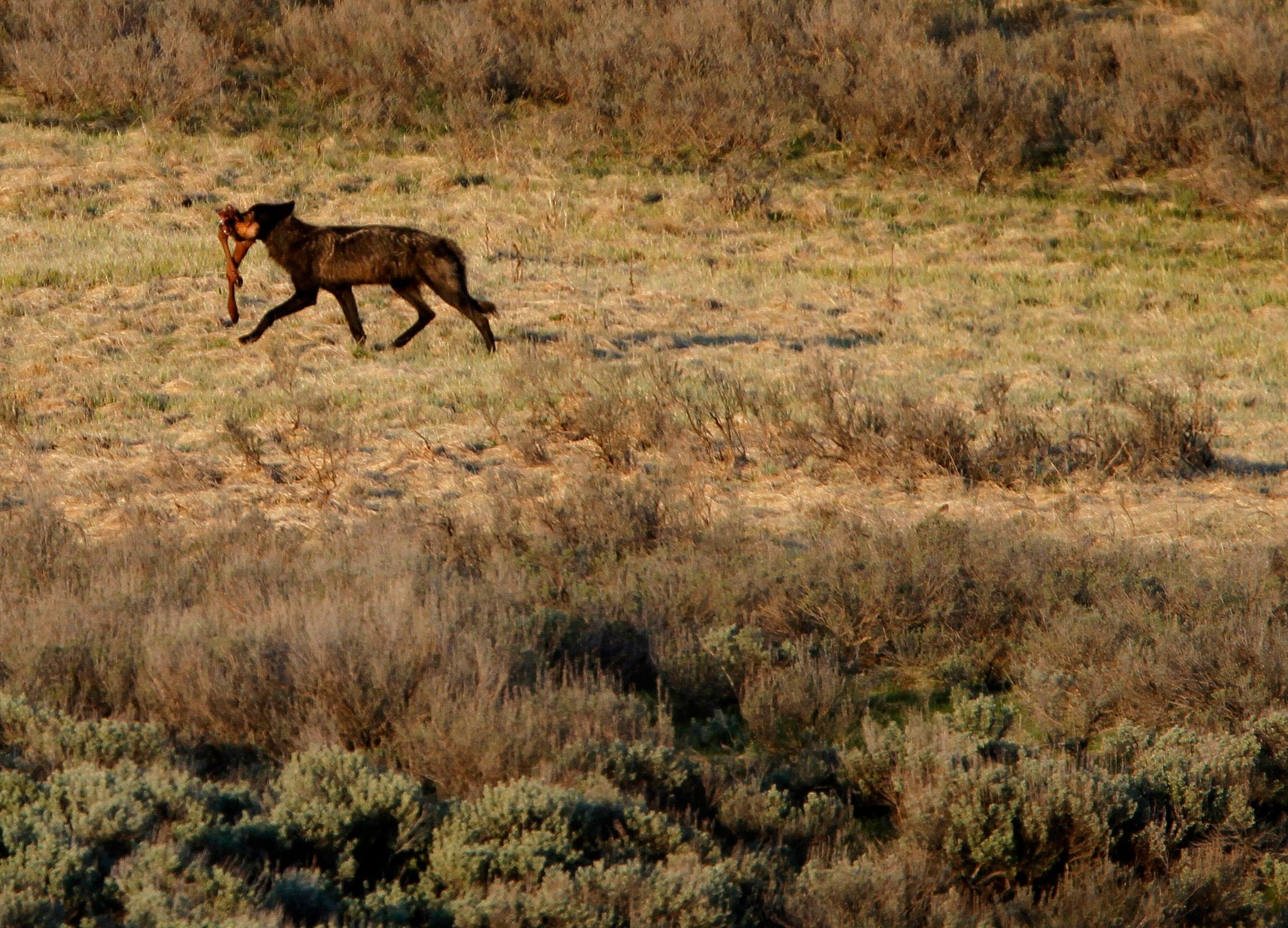一匹狼叼著一對馬鹿腿走過了黃石公園的原野。在黃石公園的冬季,馬鹿在狼的食物中佔了90%。