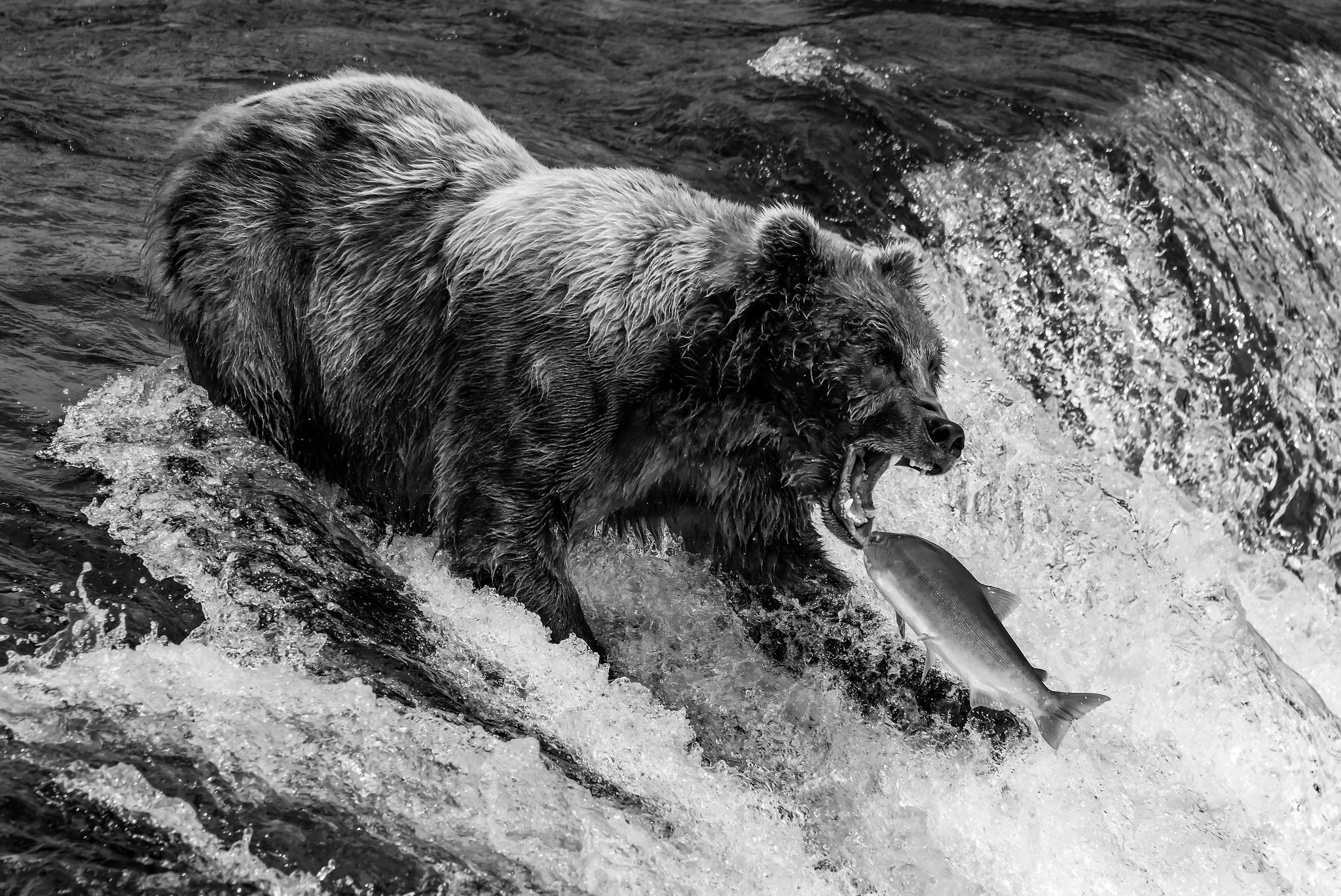 在美國阿拉斯加州的布魯克斯瀑布(Brooks Falls),有隻棕熊正在張羅牠的鮭魚大餐,牠吃剩的魚身很可能會變成狼的食物。