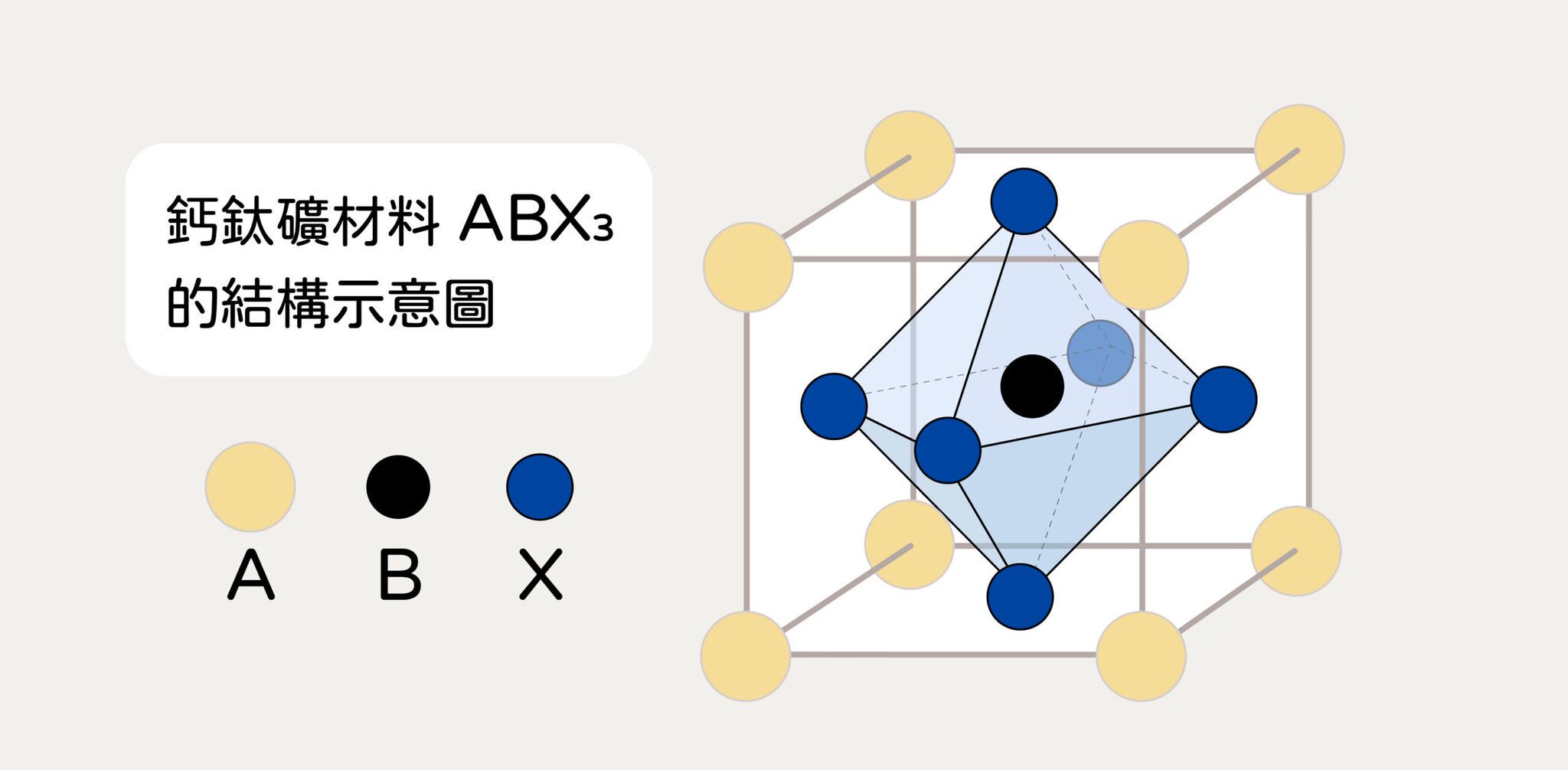 鈣鈦礦是什麼呢?最初是指鈣與鈦的氧化物 CaTiO3,而現在常講的「鈣鈦礦材料」為一種統稱,泛指擁有相似結構的金屬鹵化物材料,通式為 ABX3。要調配出優秀的鈣鈦礦材料並不容易,科學家必須像大廚一樣,運用各種「食材」煮出 ABX3。