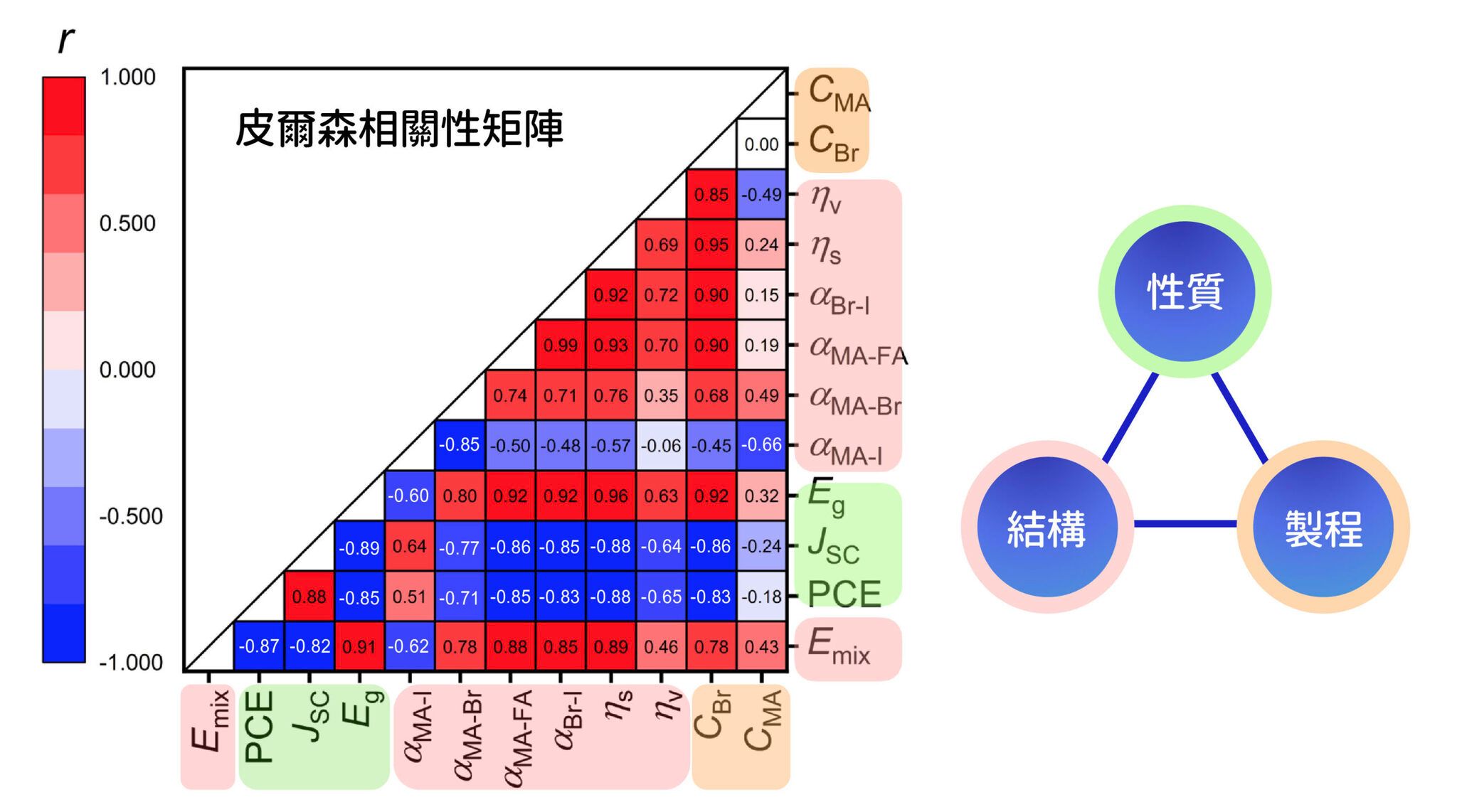 MAyFA1−yPb(BrxI1−x)3 鈣鈦礦材料透過機器學習方法模擬之後,計算出性質參數(Eg、Jsc、PCE)、結構參數(Emix、α、ηs、ηv)與製程參數(CMA、CBr)與之間的相關性。其中,r 為相關係數,紅色正值表示兩者正相關,藍色負值表示兩者負相關。