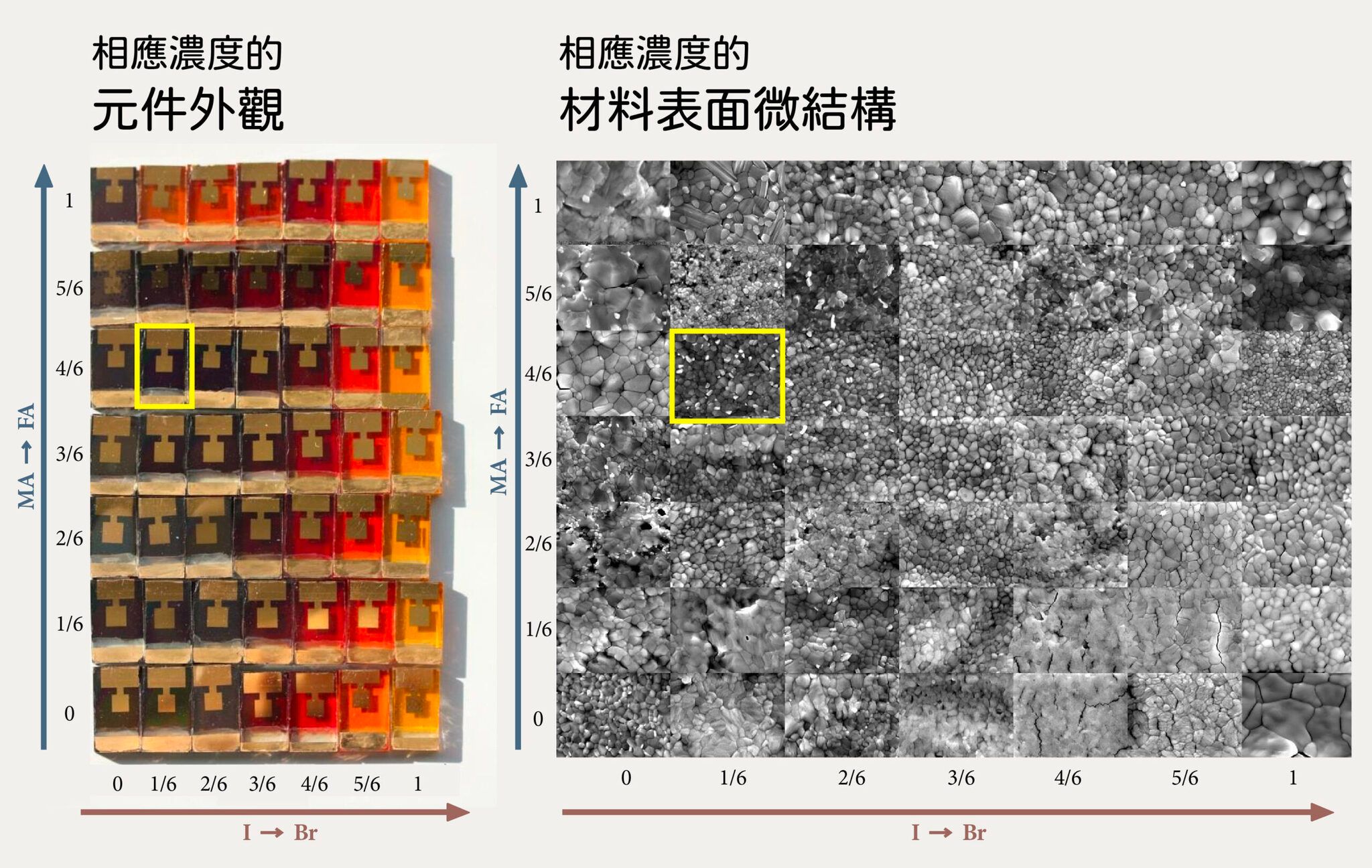 國外團隊為了找到 MAyFA1−yPb(BrxI1−x)3 最佳比例,做出 49 種不同的鈣鈦礦太陽能電池,黃框處即為最佳比例。左圖為相應濃度的元件外觀,右圖為相應濃度的材料表面微結構。