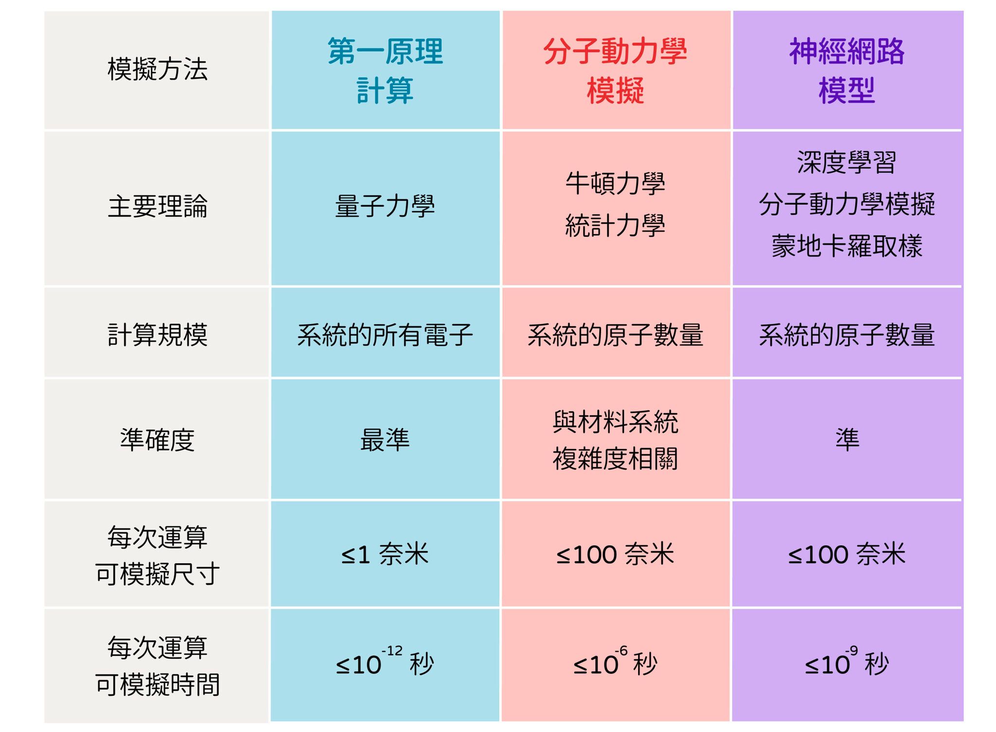 第一原理計算僅適合用在 1 奈米以內尺度,計算準確耗時;分子動力學模擬可用於 100 奈米尺度,計算省時卻不夠精準;透過機器學習建立的神經網路模型,可以快速模擬 100 奈米尺度的材料,也保留高準確度。