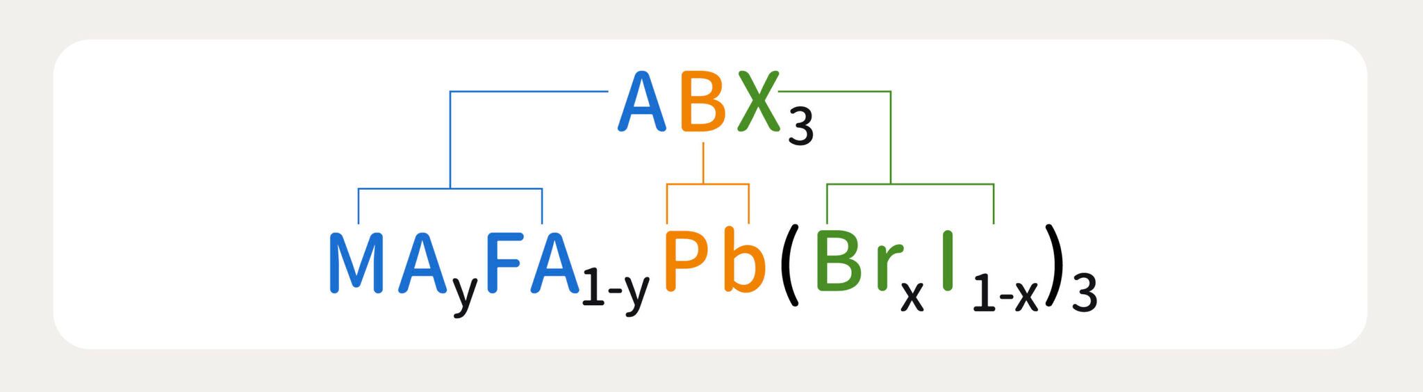 圖片為鈣鈦礦材料通式 ABX3 對應到混合離子鈣鈦礦材料 MAyFA1−yPb(BrxI1−x)3 之示意圖。