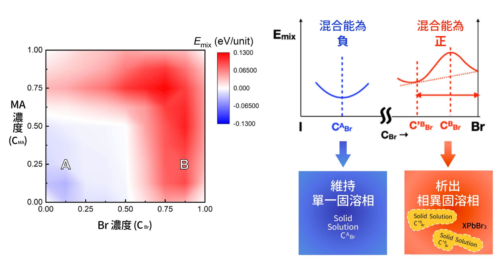 MAyFA1−yPb(BrxI1−x)3 鈣鈦礦材料的混合能 Emix分布,藍色表示混合能為負(維持單一固溶相),紅色表示混合能為正(析出相異固溶相),可以看到 Br 和 MA 濃度高的時候,容易析出化合物。其中,縱軸 y 為 MA 濃度(CMA),橫軸 x 為 Br 濃度(CBr)。