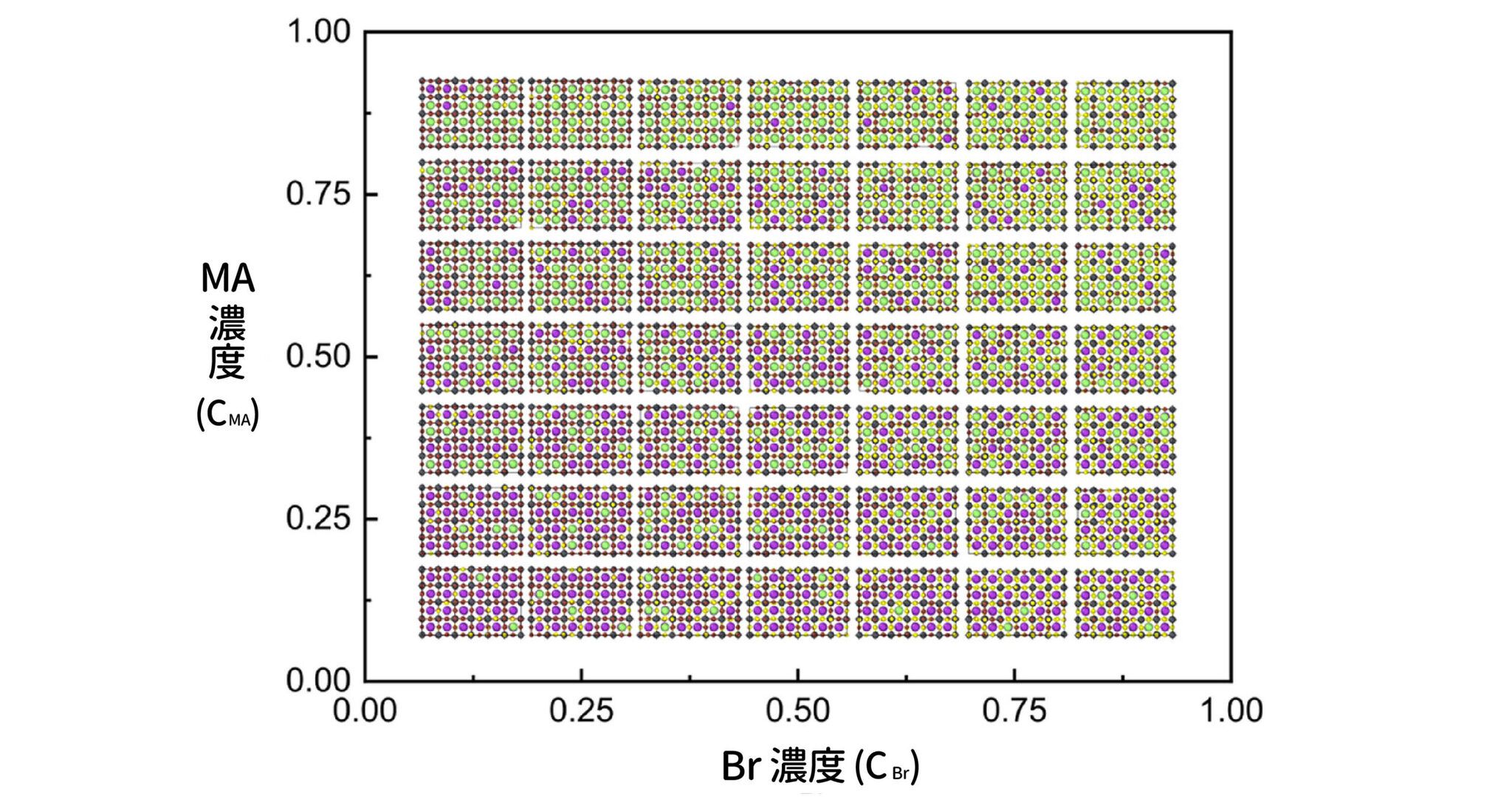 MAyFA1−yPb(BrxI1−x)3 鈣鈦礦材料的最低能量原子結構,縱軸 y 為 MA 濃度(CMA,從 MA0-FA1到 MA1-FA0),橫軸 x 為 Br 濃度(CBr,從 Br0-I1 到 Br1-I0),各自 9 等分。為求圖片簡潔,省略 x, y = 0 或 1 的結構圖。