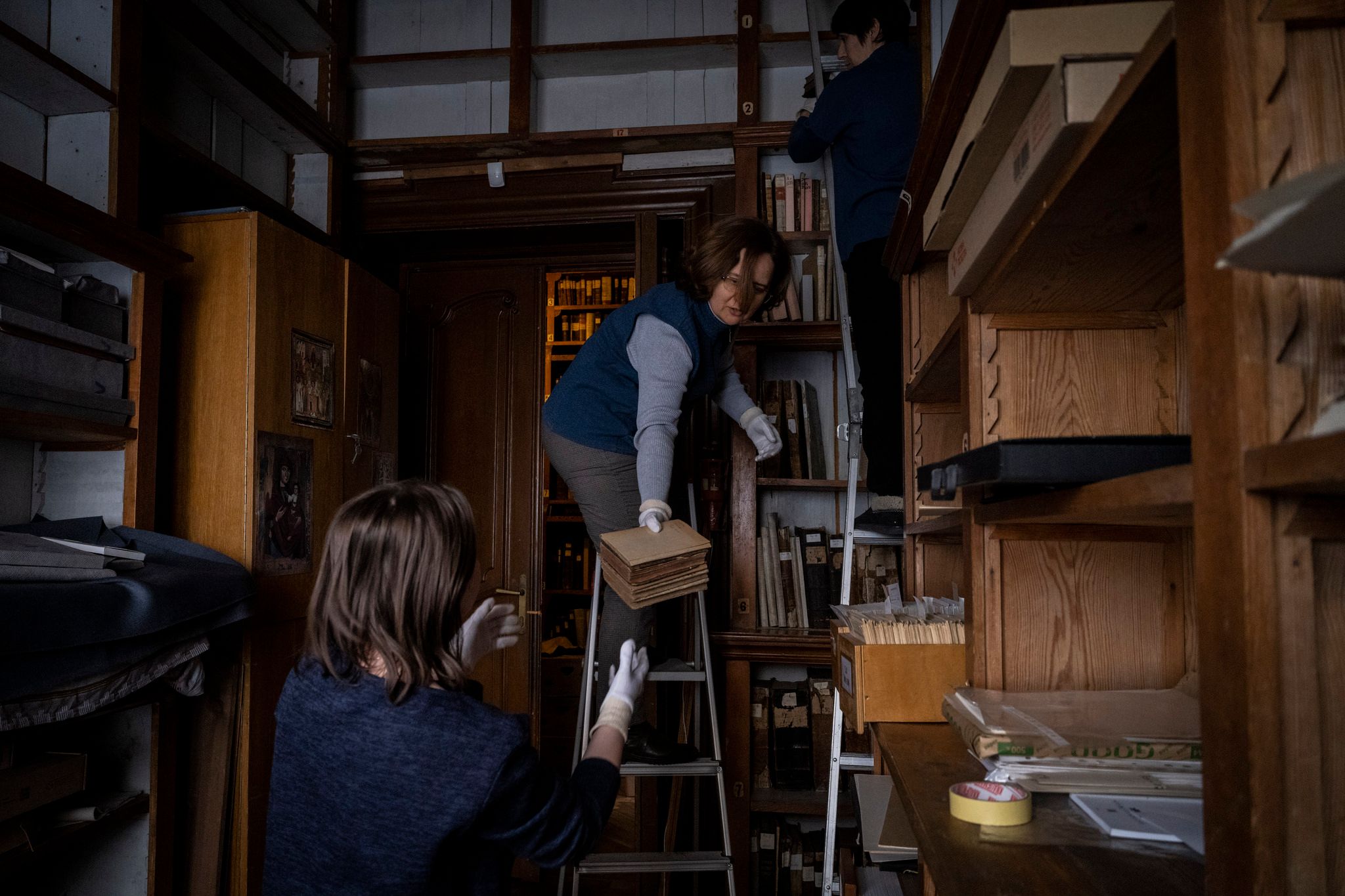 經歷過兩次世界大戰的利沃夫博物館,此次面對另一場戰爭,館員們各自埋首在他們的工作區域,有人小心翼翼地將每件文物裝箱,有人齊心協力從牆上卸下18世紀的聖像畫屏(iconostasis),緩步走下博物館主階梯,將展品移動到安全的空間儲藏。