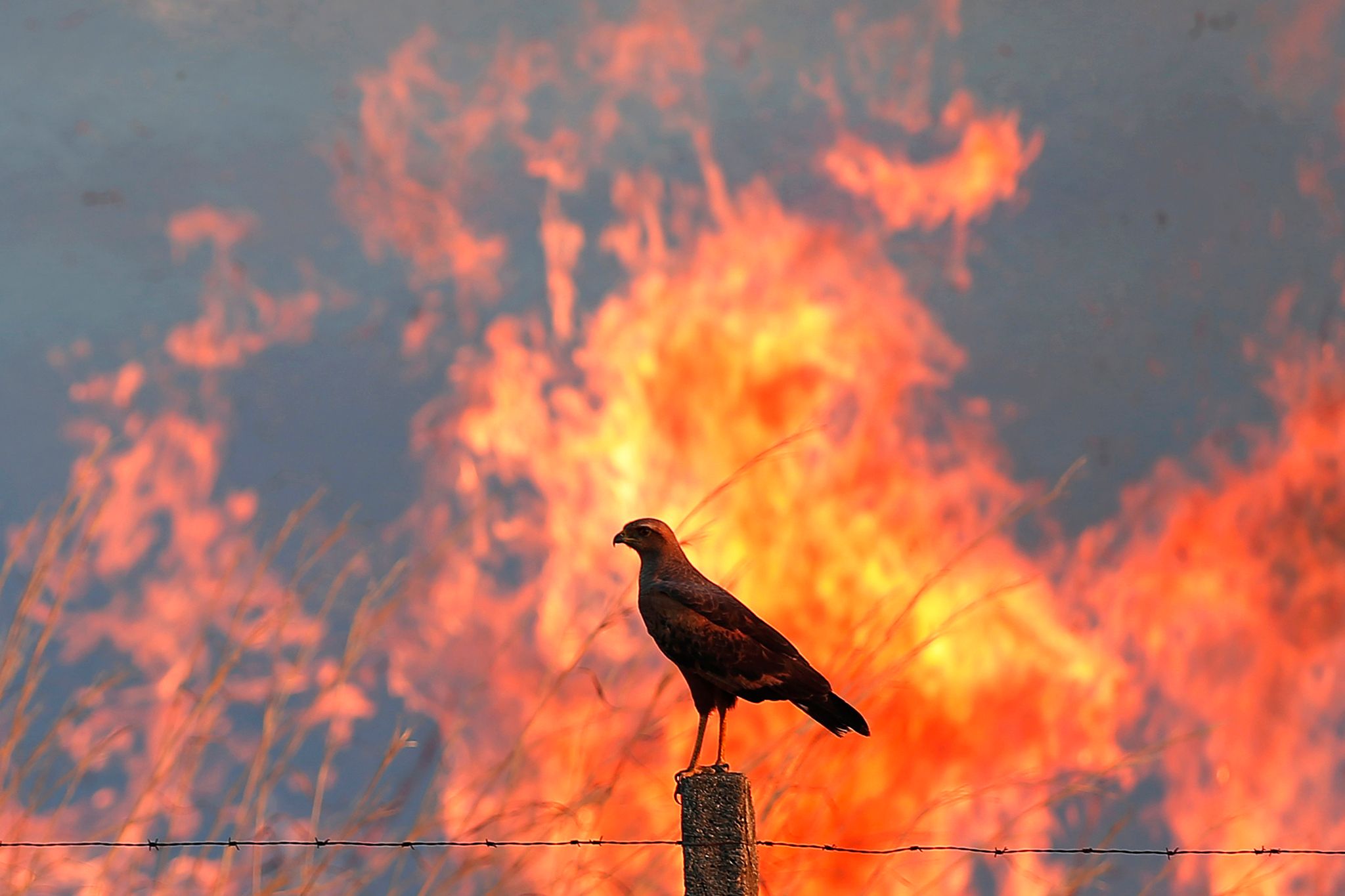 猛禽在世界各地的火災中捕食──在澳大利亞、迦納、巴西、巴拿馬、宏都拉斯和巴布亞紐幾內亞的草原和稀樹草原──利用逃離大火的獵物大快朵頤。甚至有一個詞來形容牠:大火中的肉食動物(pyric-carnivory)。火作為打手,將生物趕出灌木叢。在非洲南部的大草原上,紅隼(kestrel)和胡狼暗棕鵟(jackal buzzard)在野火周圍轉來轉去,捕食受傷、暴露或被火焰殺死的小型哺乳動物和爬行動物。人們曾看過遷徙的密西西比灰鳶(Mississippi kite)在德州的夏季大火中捕食沸騰的昆蟲雲。