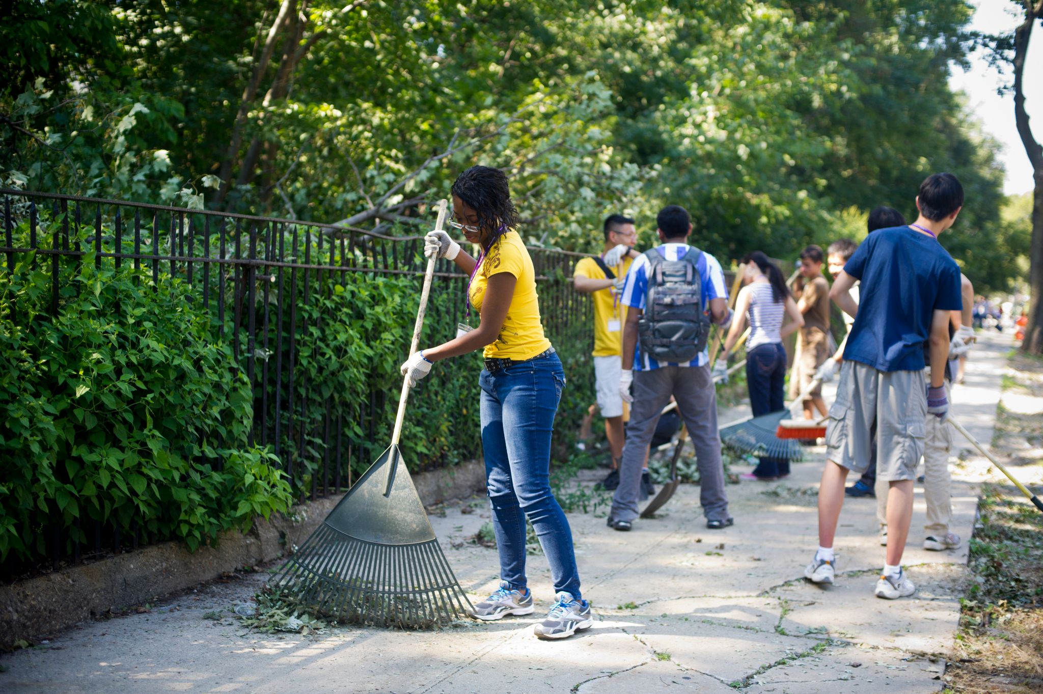 圖為2011年美國紐約大學(New York University,NYU)學生志工在打掃公園的畫面。