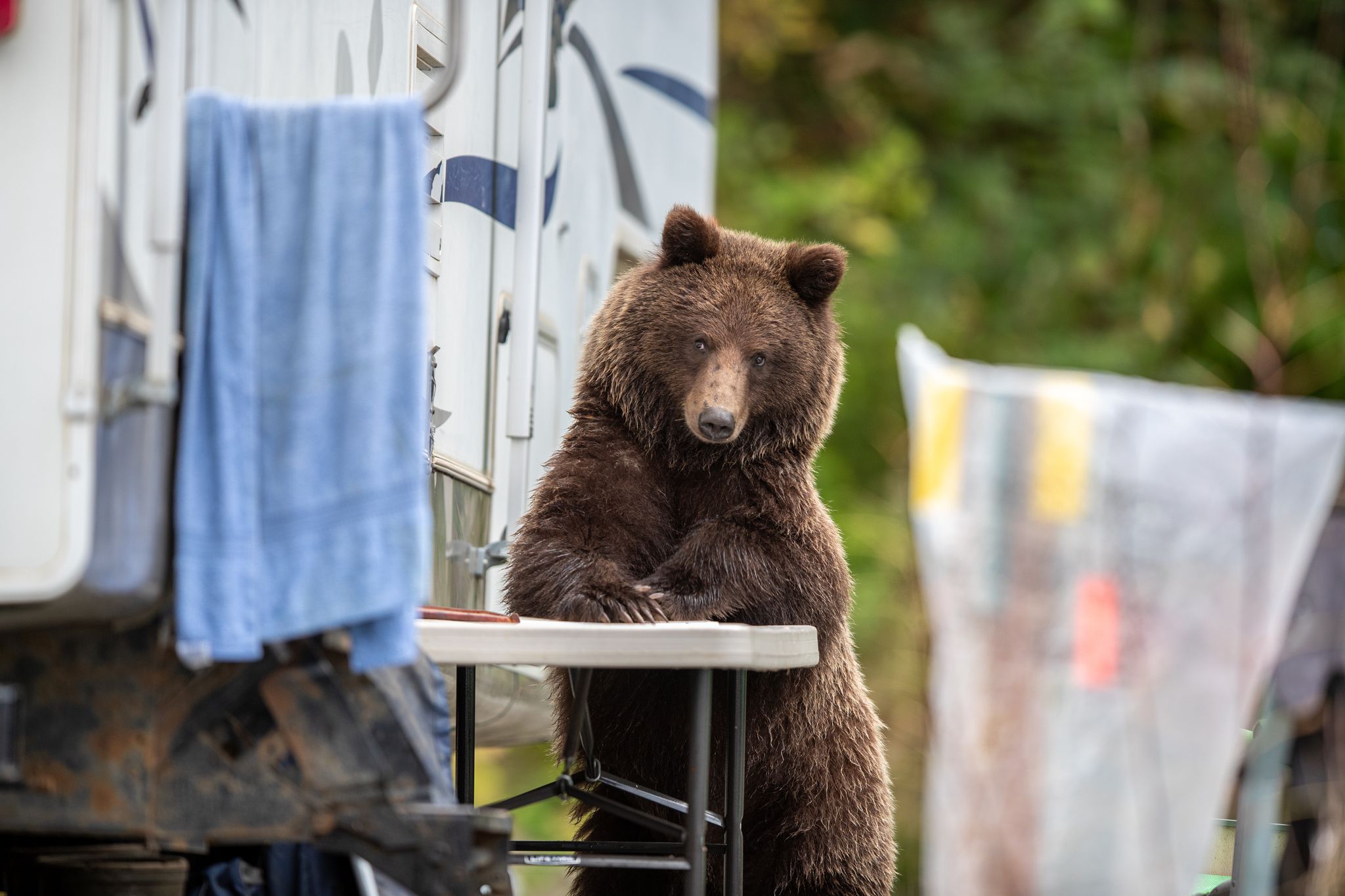 圖中這隻熊聞到了露營車外餐桌上的鮭魚香,緩慢靠近車子後,卻發現牠的行蹤被人類察覺,鮭魚也被人類迅速收進了車內。照片拍攝於2019年的阿拉斯加海恩斯(Haines)。