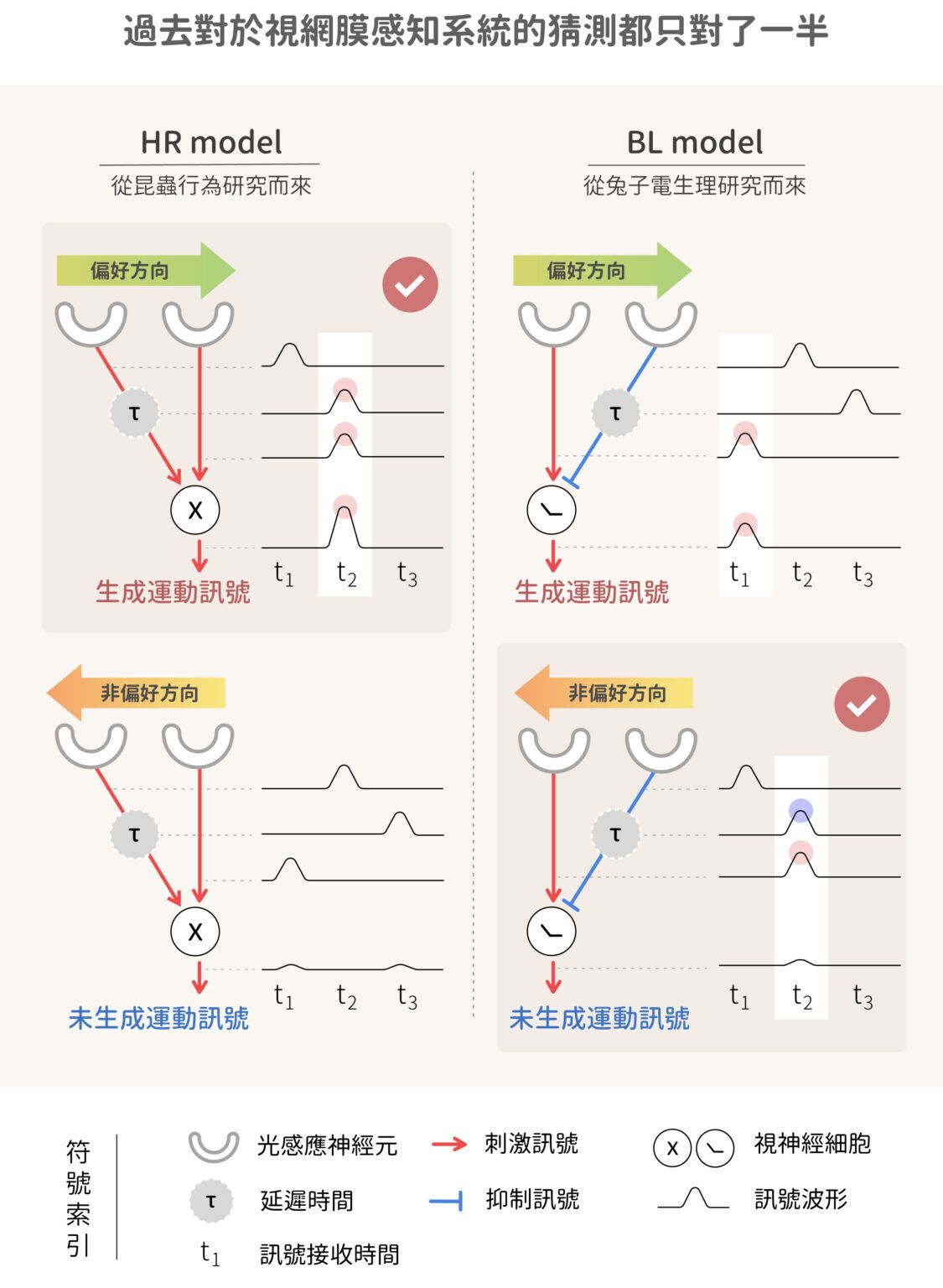 關於視網膜感知系統的運算機制,過去 HR 理論和 BL 理論都只猜對其中一種方向(打勾處)。