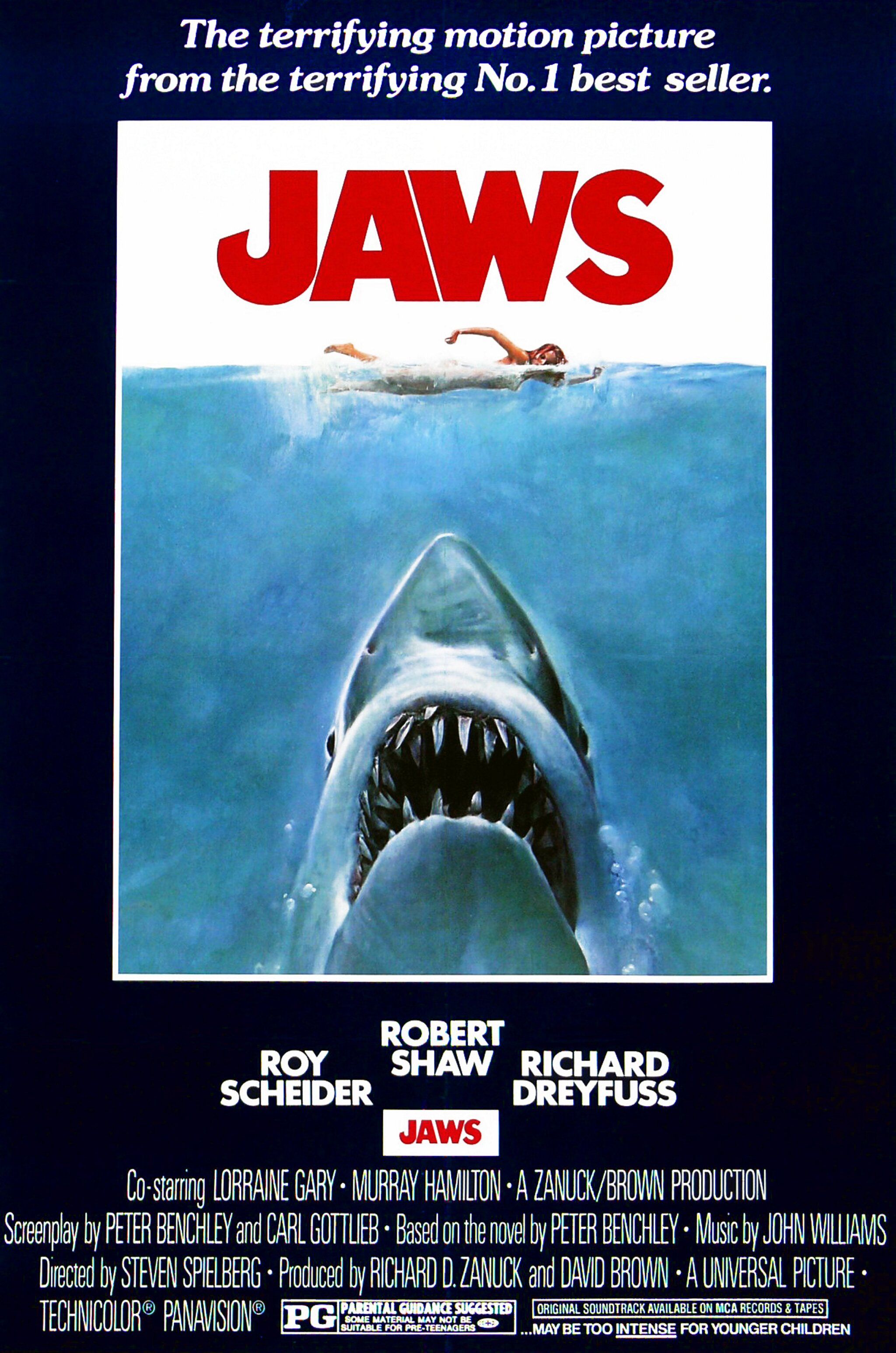 圖為史蒂芬·史匹柏(Steven Spielberg)於1975年執導的電影《大白鯊》海報。