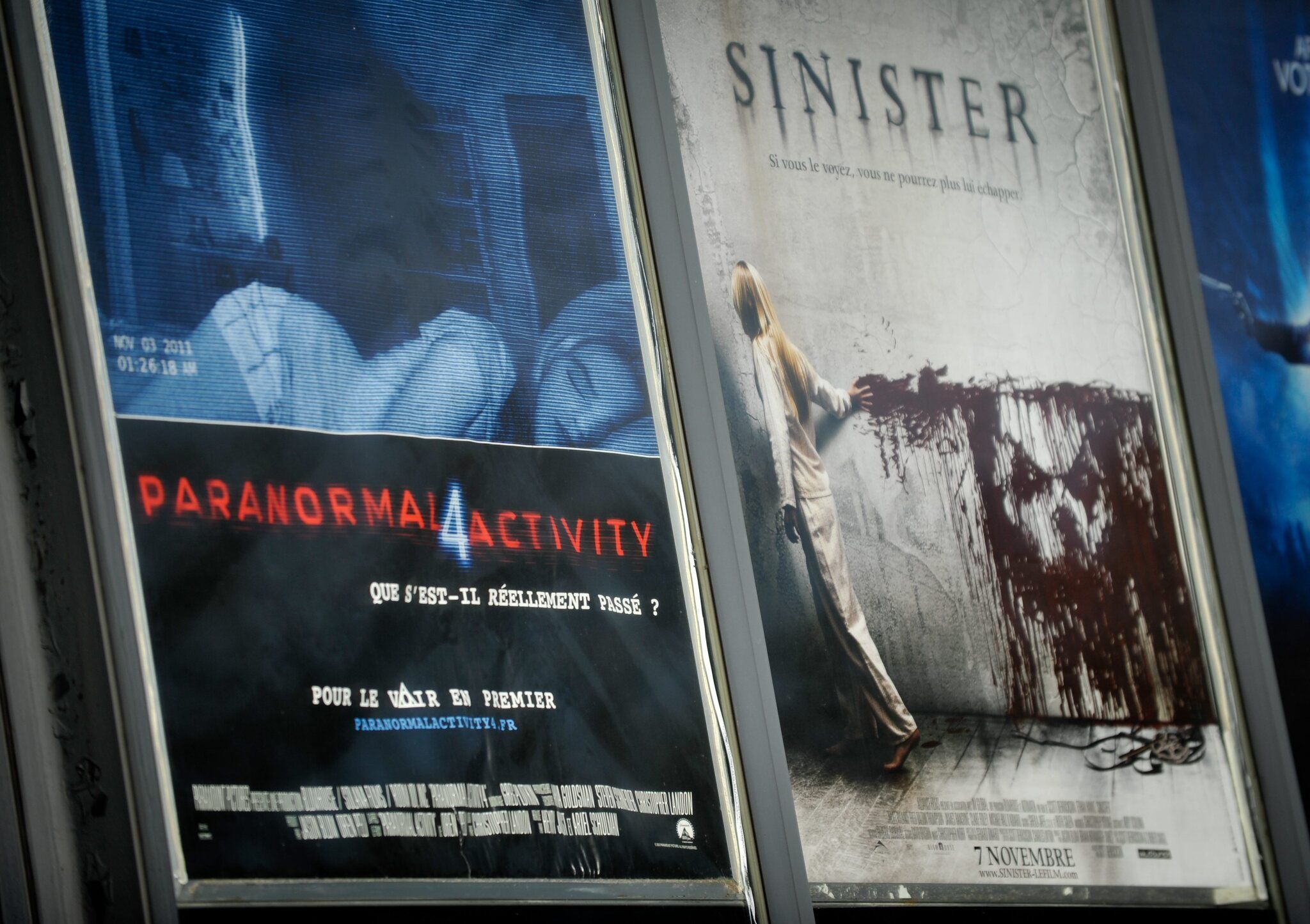 圖為2012上映的《鬼入鏡4》(Paranormal Activity 4)電影海報(左),和同年發行的超自然恐怖電影《凶兆》(Sinister)(右)。