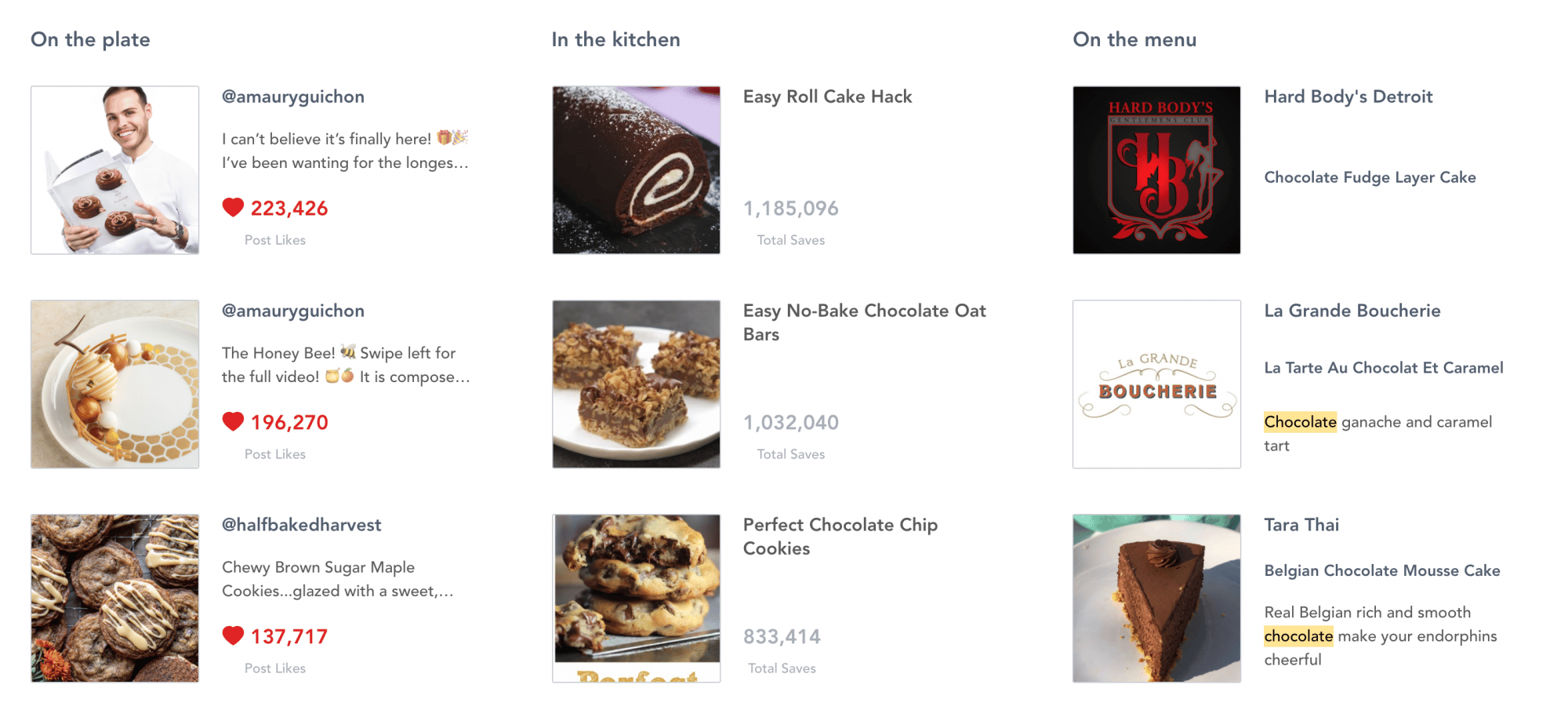 同時,用戶亦能在搜尋頁面輸入某種口味,查看該口味目前的討論熱度。以巧克力為例,Tastewise會分析該單字去年到今年的社群討論流量,讓用戶點進有巧克力單字的Instagram的貼文,查看這篇文章內容,也能顯示有哪些餐廳菜單含有巧克力這個字詞,以及與巧克力相關的其他熱門口味。