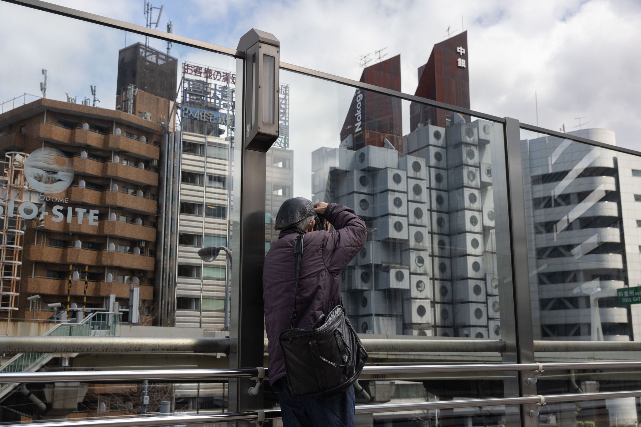 一名男子在中銀膠囊塔的拆除前夕前往拍攝,留下最後的紀念。
