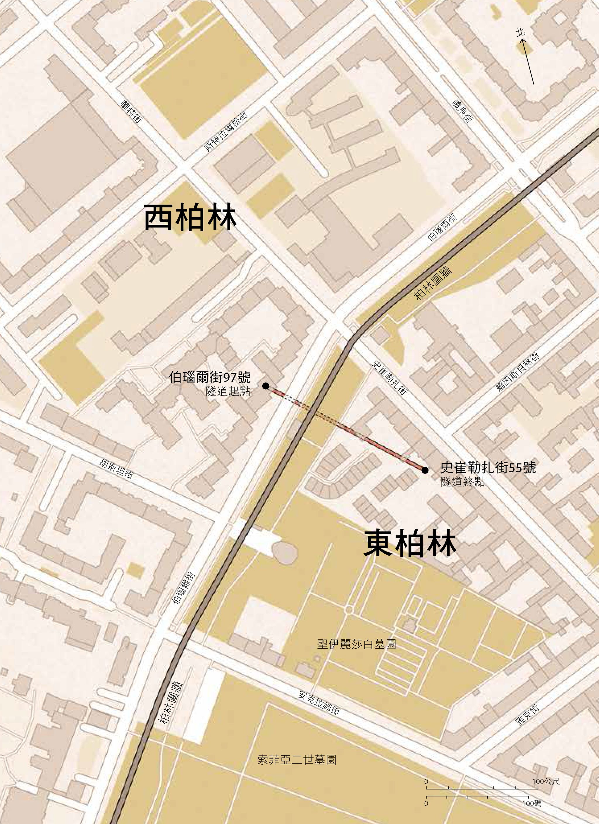 消息迅速傳開。整整兩晚,史崔勒扎街(Strelitzer Straße)55號迎來外表看來十分冷靜的訪客,這些人透過這條地下通道成功逃往西德,獲得新生活。在不超過80公分寬的隧道──高度甚至更低──逃亡者必須用肚子貼地,一路爬行,慢慢往前推進。140 公尺後,他們終於抵達安全的廢棄麵包坊,越過圍牆到另一邊, 終獲自由。