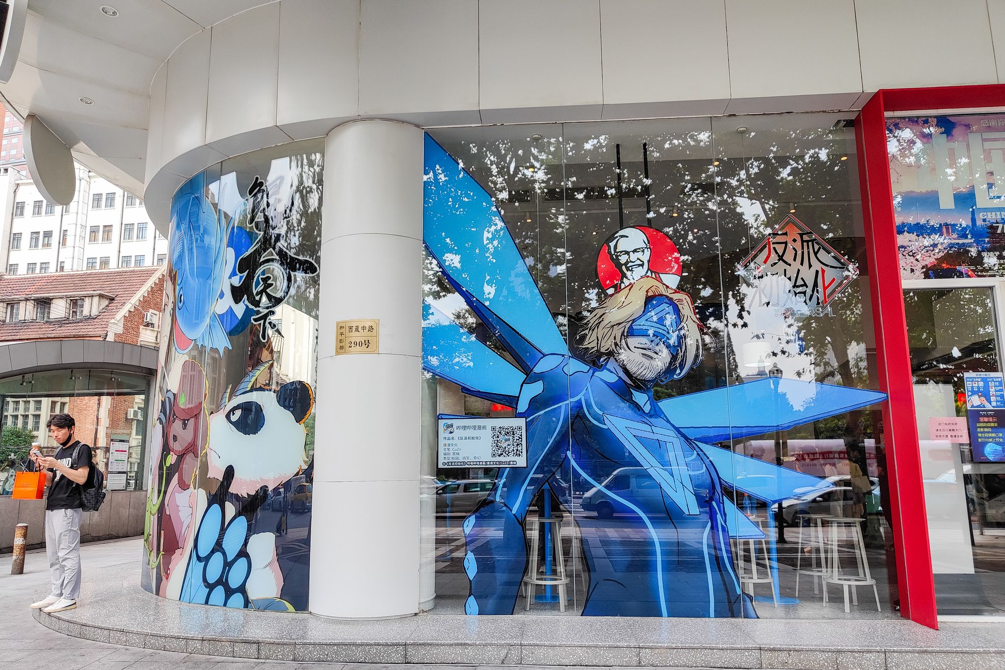 圖攝於2021年8月23日,上海人民廣場附近的一家肯德基店外。店門口的牆壁和玻璃上,佈滿Bilibili上連載的中國漫畫。