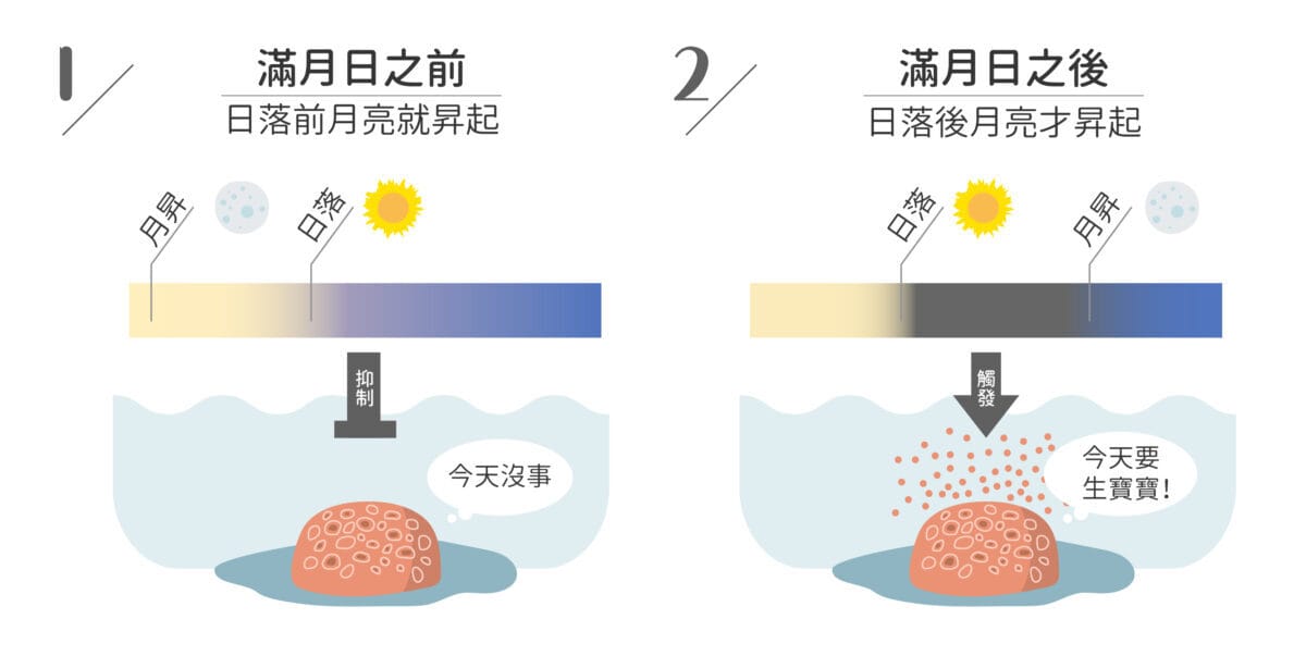 研究團隊經過長年自然觀察以及實驗條件的控制,終於找出珊瑚同步產卵的秘密,關鍵就在繁殖季的滿月日之後的黑暗期。圖1顯示滿月日之前,月光會抑制珊瑚產卵,圖2顯示滿月日之後,日落月昇中間的黑暗期,觸發了珊瑚產卵的條件。