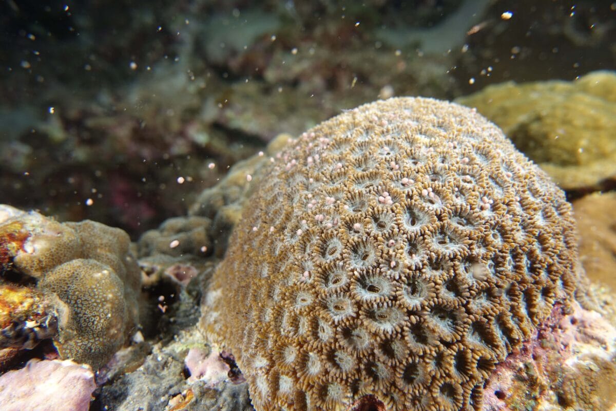 野澤洋耕的團隊在臺灣綠島進行長期觀察和研究,終於發現珊瑚同步產卵的關鍵因素。珊瑚繁殖季(南臺灣約 4-6 月)滿月過後,日落到月昇之間的黑暗期觸發了珊瑚產卵的條件。圖片為正在產卵的環菊珊瑚。