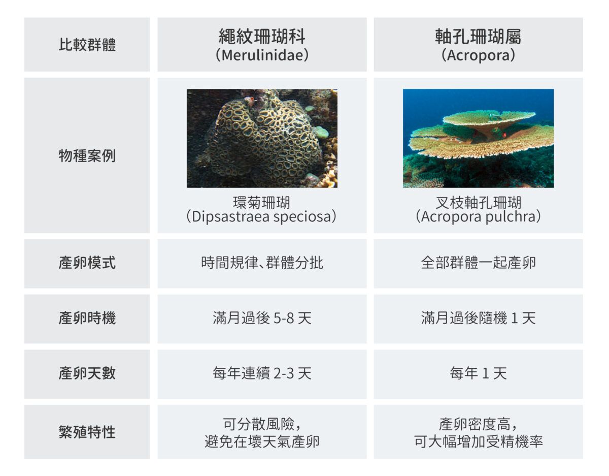 根據研究團隊現有紀錄,隸屬於繩紋珊瑚科(Merulinidae)的珊瑚是採取分散風險策略,不同群體分批同步產卵。雖然群體間產卵日子錯開,但時程非常固定,都是在「滿月」之後五到八天;綠島還有另一大宗珊瑚,是分在軸孔珊瑚屬(Acropora)下的一些種類,牠們是「全部」約好在同一天產卵,但到底是哪一天,每年觀察到的日期都不太一樣。