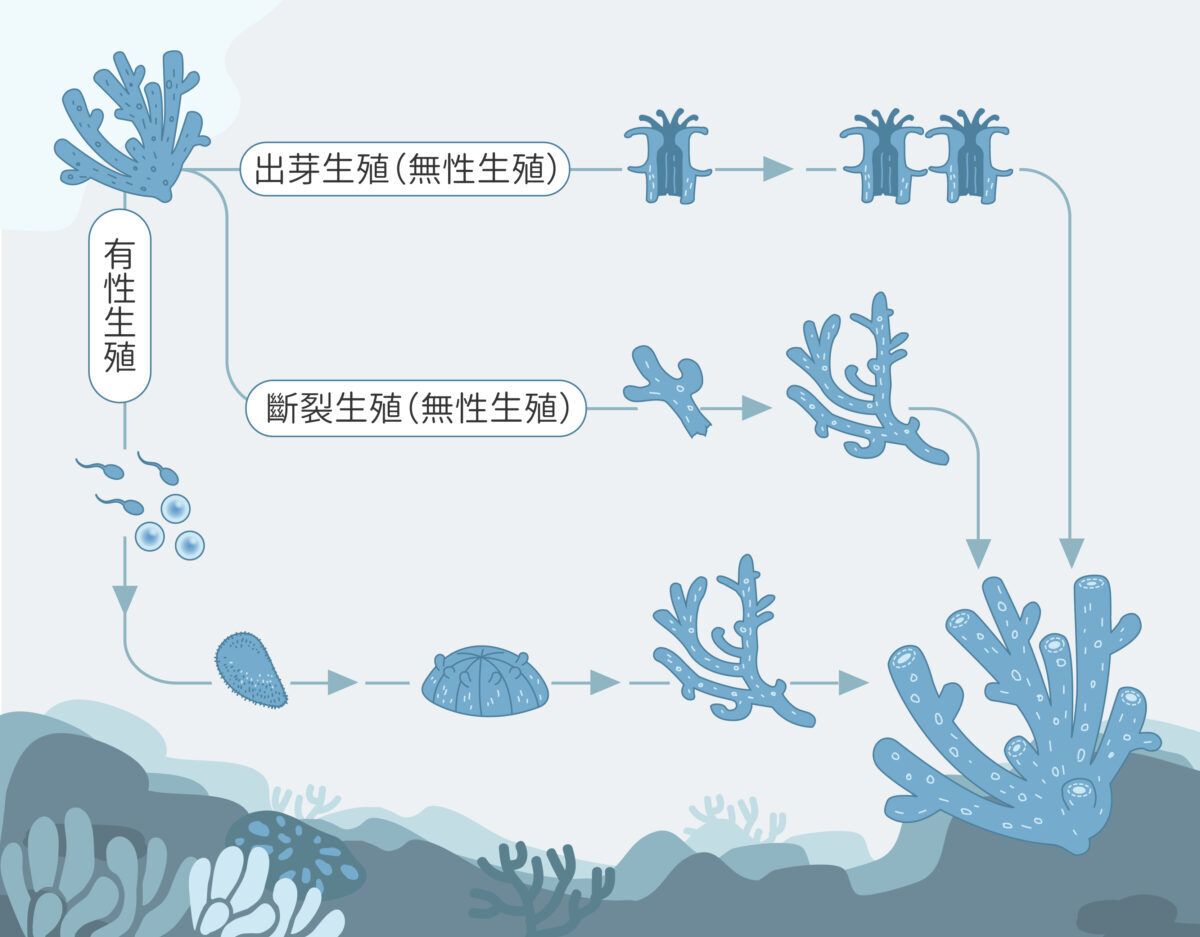 珊瑚可以透過無性生殖和有性生殖繁衍個體。