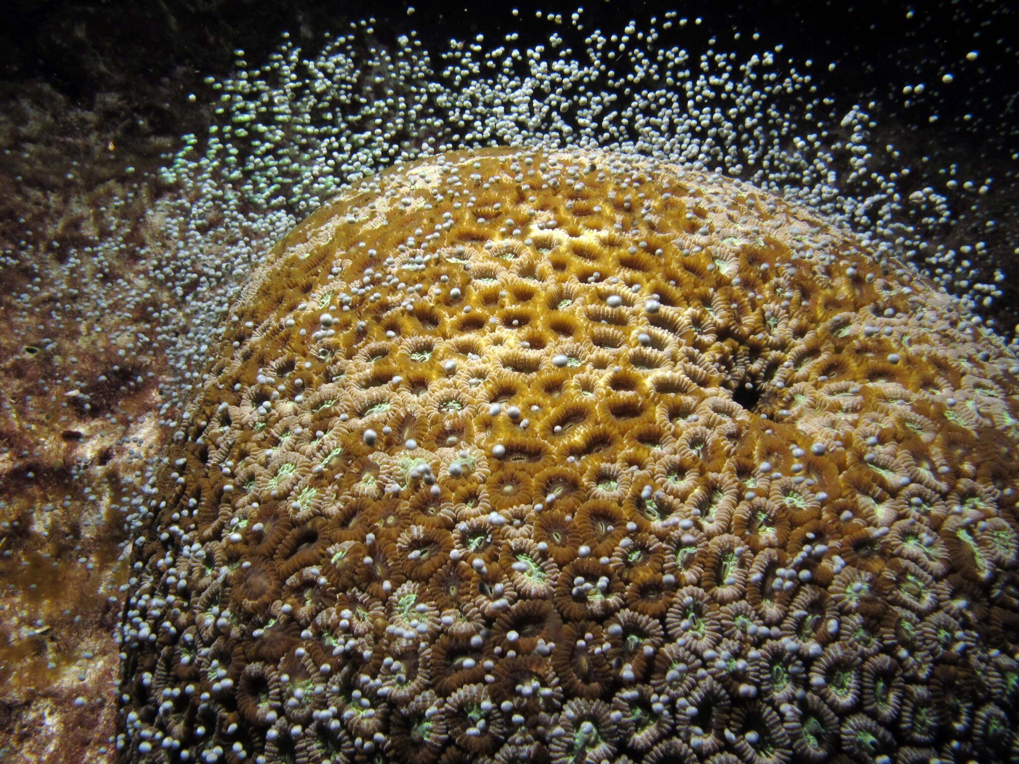 不像魚類可以找到配偶後再產卵受精,固定不動的珊瑚只能直接把精卵釋放到海水中。為了克服無法移動的劣勢,牠們會採取同步策略,約好在短時間內一起排出數量驚人的精卵。如此一來就能大大提高精卵濃度來增加受精成功率,即使有掠食者在旁想趁機飽餐一頓,也會頓時眼花撩亂、顧此失彼。