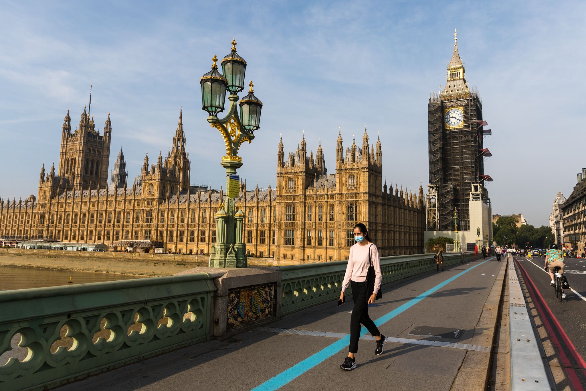 一名女子行經英國倫敦市中心的街道,她的身後是英國國會(Parliament of the United Kingdom)與正在進行修復工程的大笨鐘(Big Ben)。照片拍攝於2021年9月。