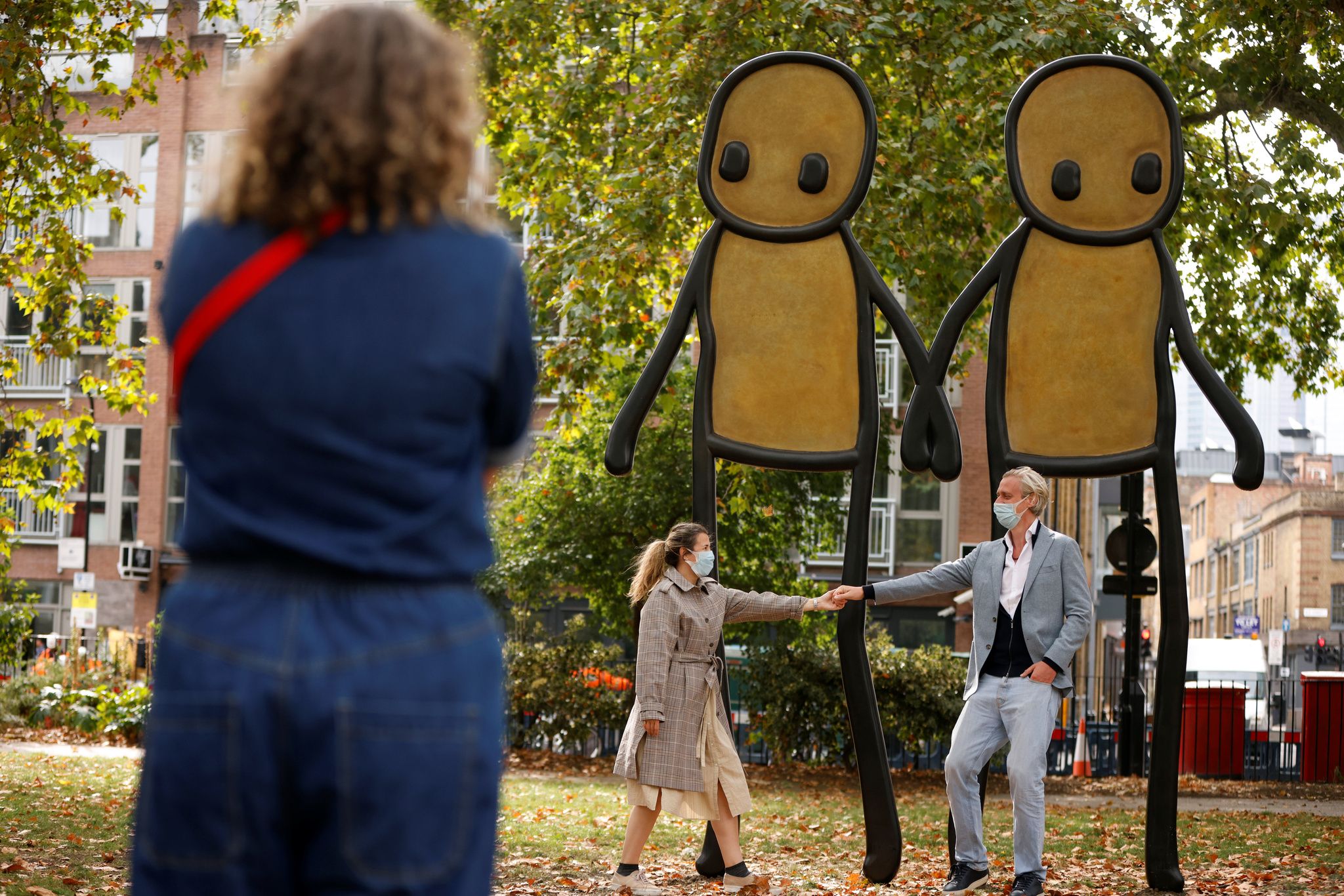 一對情侶在名為《牽手》(Holding Hands)的裝置藝術前開心的拍照留念。照片拍攝於2020年9月的英國倫敦霍克斯頓廣場(Hoxton Square)。