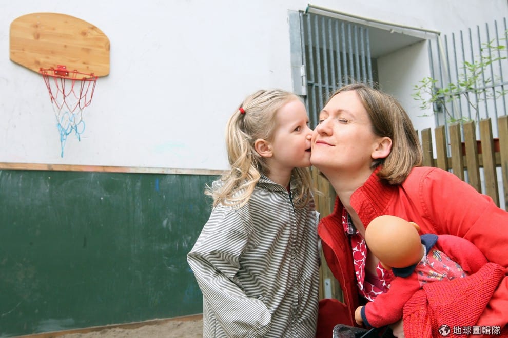 3歲要上幼稚園囉!妹妹跟媽媽親親說掰掰!圖片來源:Adam Berry/Getty Images