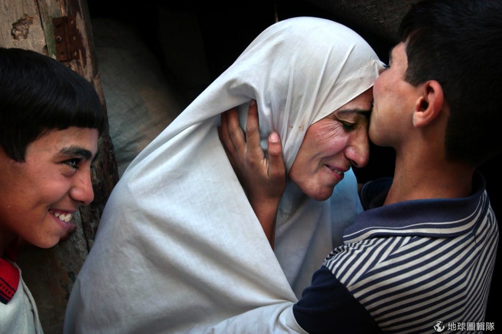 約旦的兩兄弟,對媽媽親親抱抱,很開心!圖片來源:Chris Hondros/Getty Images