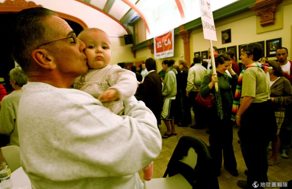 照片中的大叔抱著朋友的小貝比忍不住親了起來,小貝比的臉好困惑,哈哈!圖片來源:Sandy Huffaker/Getty Images