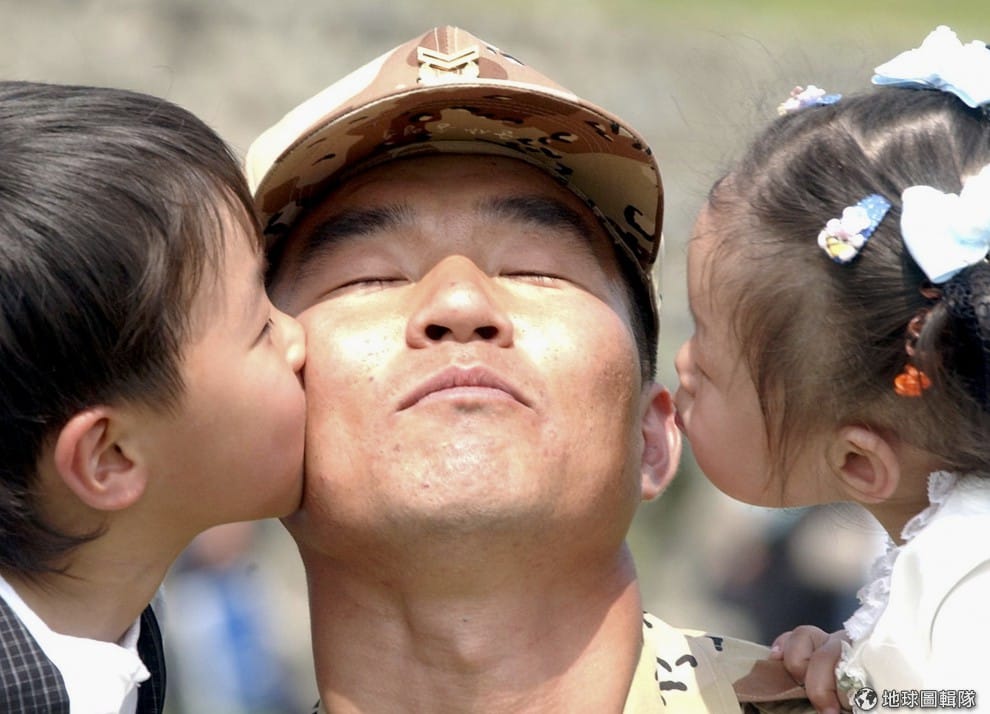 南韓的軍官將跟兒女說掰掰,全抱在一塊又親又抱。圖片來源:Getty Images