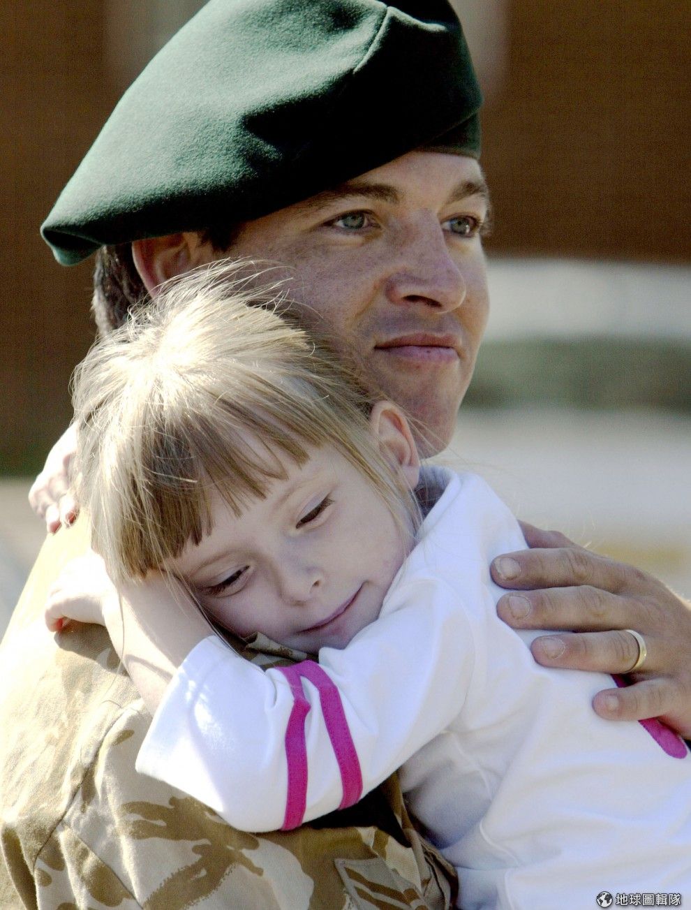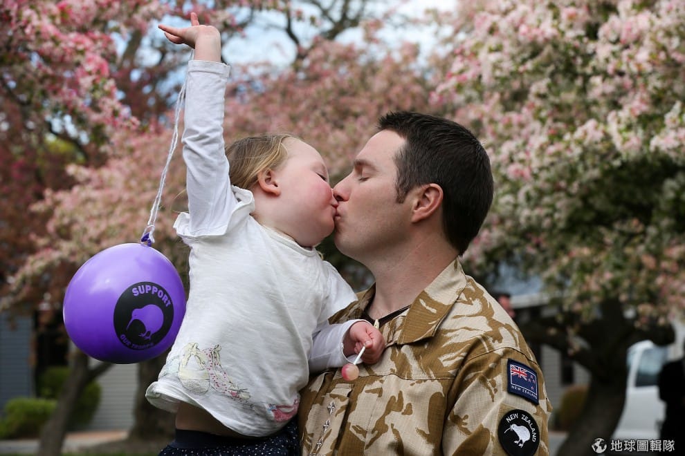 4歲的妹妹和爹地親親,因為待會她的爹地就要前往阿富汗駐軍了!要把握這難得相聚的時光。圖片來源:Martin Hunter/Getty Images