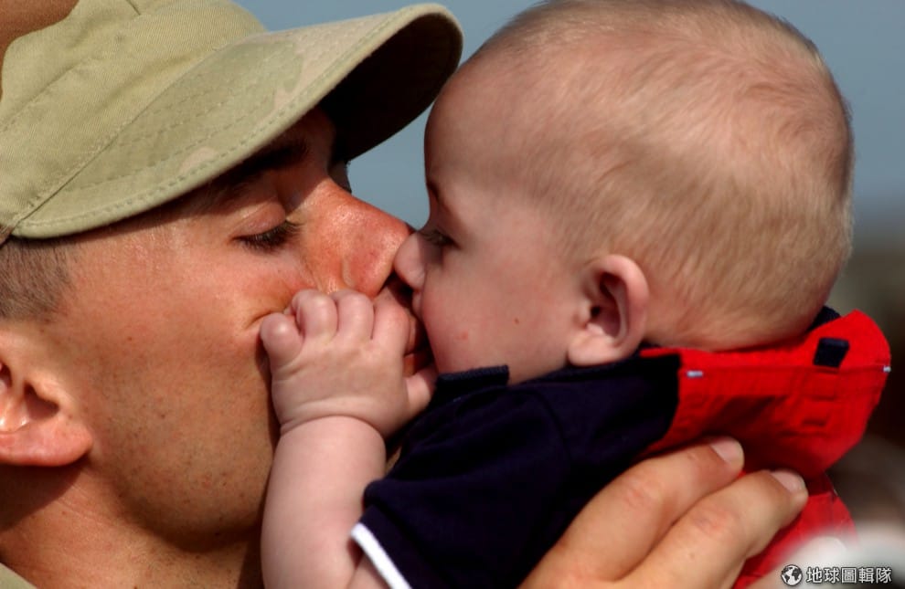 輪調回家將的美國軍官,跟他13個月大的小寶貝相聚,忍不住多親幾下!圖片來源:Sandy Huffaker/Getty Images