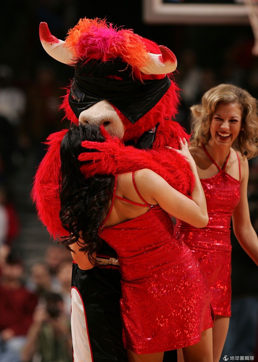芝加哥公牛隊的賽事上,玩偶人把一旁的舞者抓過來親幾下!嗨翻全場!圖片來源:Jonathan Daniel/Getty Images