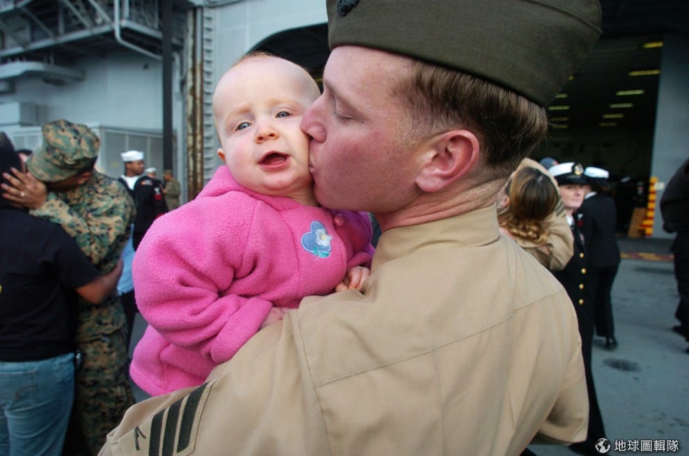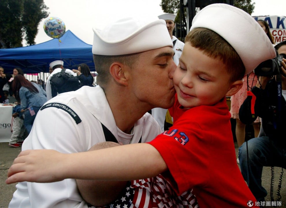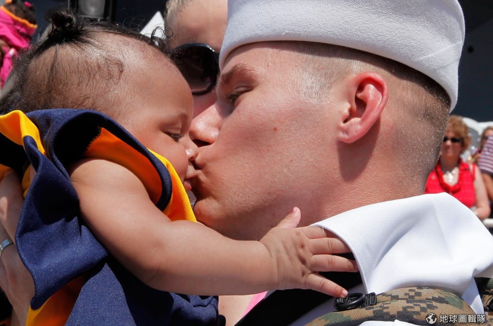 美國海軍解除海上任務,跟小兒子重聚快親親抱抱!圖片來源:Justin Sullivan/Getty Images