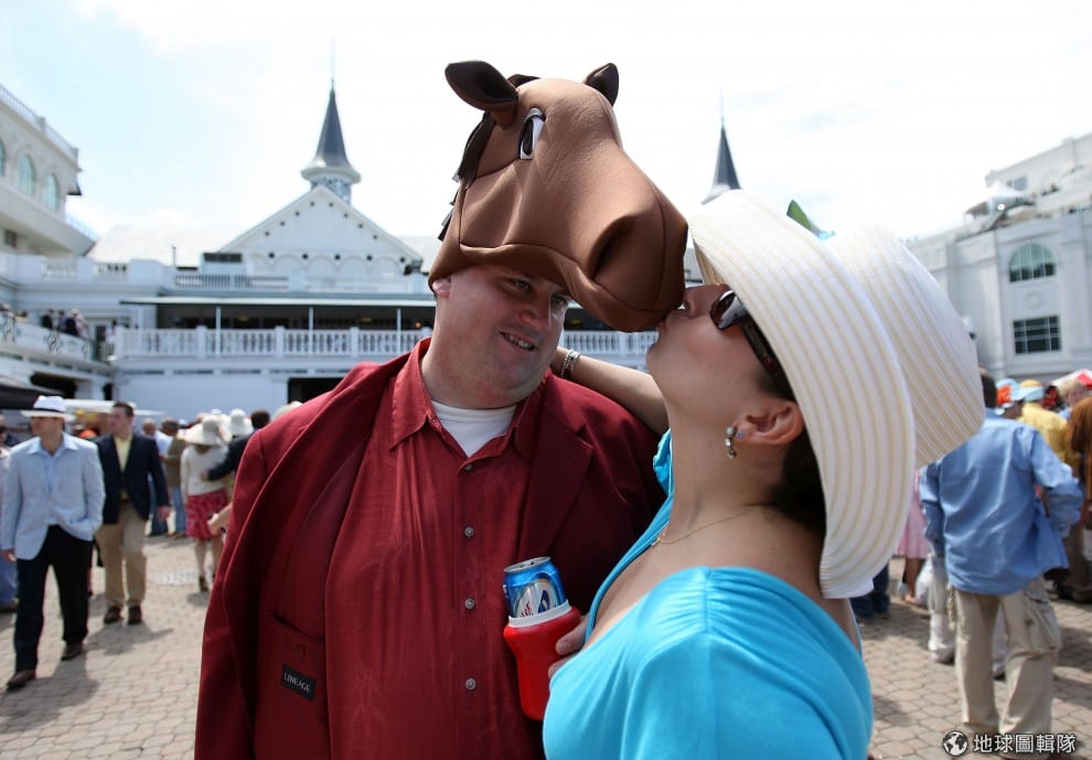 美國一對參加活動的夫妻,俏皮的表演馬嘴親親!圖片來源:Andy Lyons/Getty Images