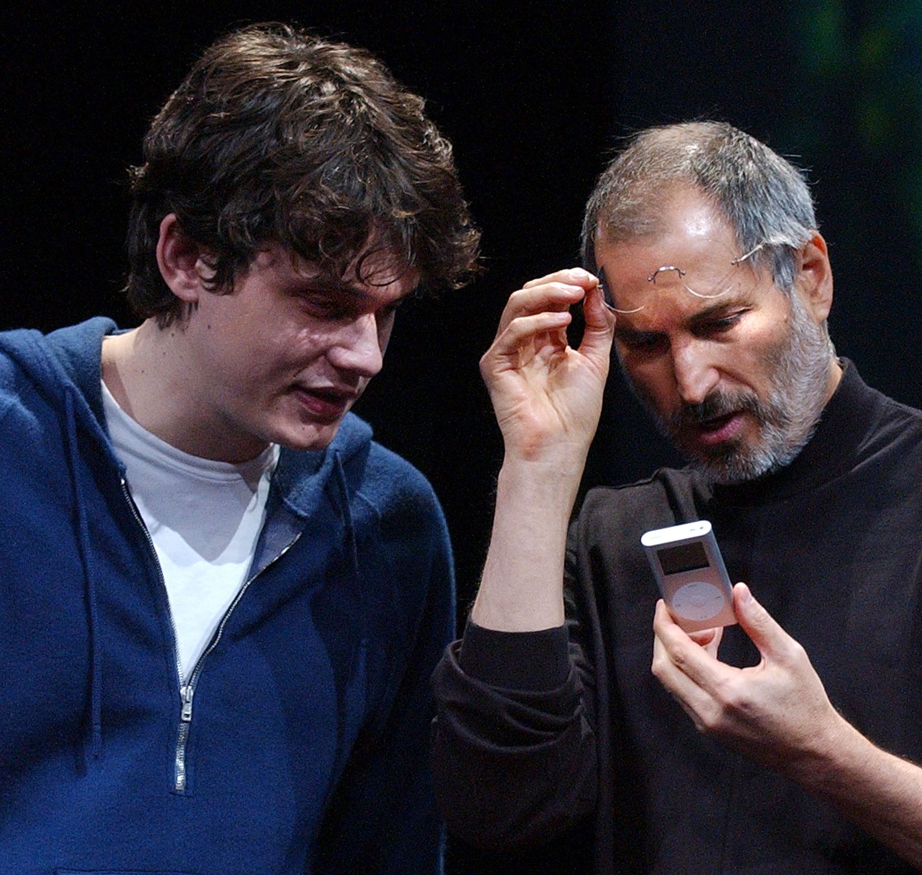 在2004年的MacWorld會議與博覽會(Macworld Conference and Expo)上,賈伯斯(右)與知名歌手約翰·梅爾(John Mayer,左)一同端詳新推出的iPod mini。