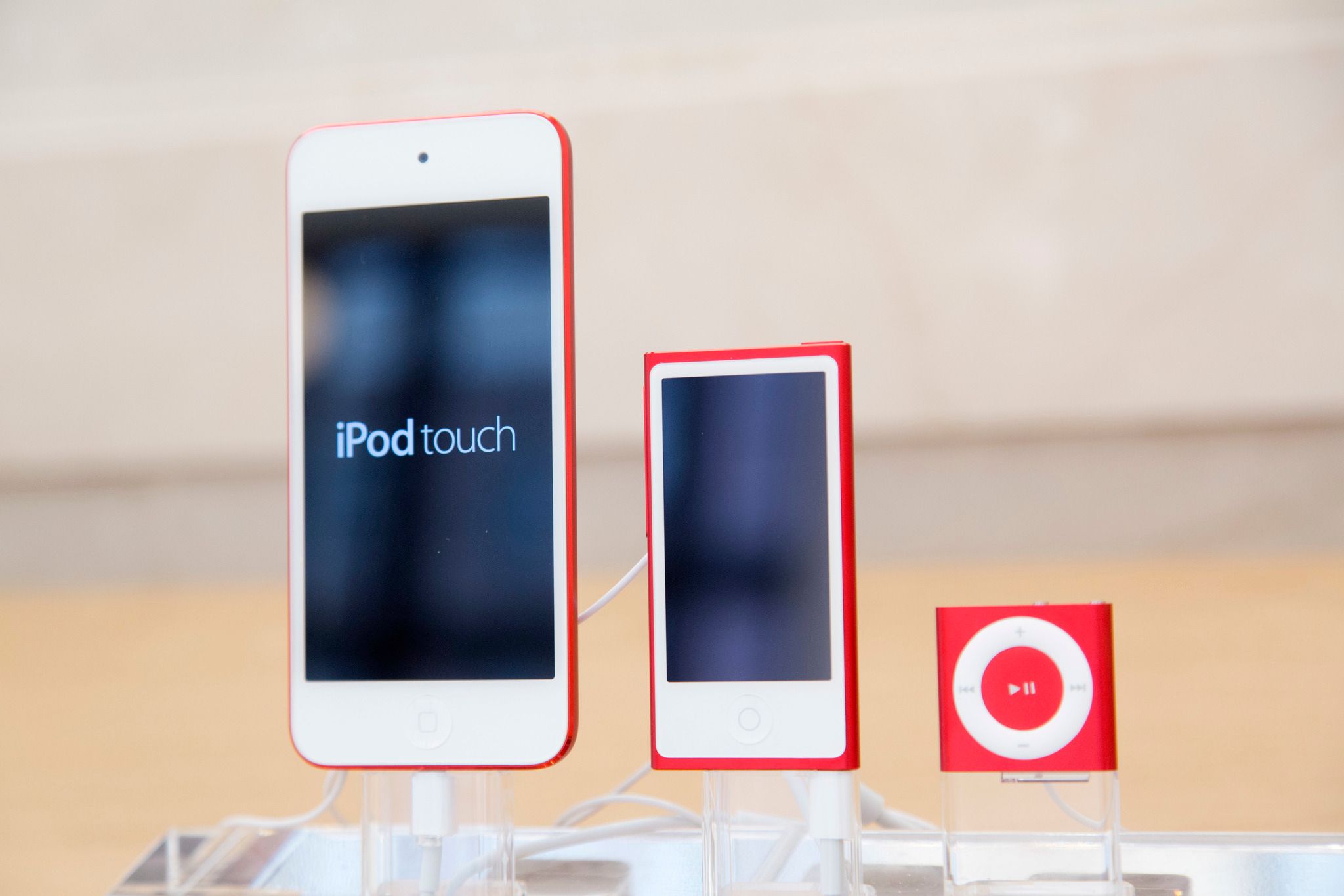 照片攝於2015年,美國紐約的一間Apple Store展示出了不同款式的iPod,從左至右分別是iPod touch、iPod nano和iPod shuffle。