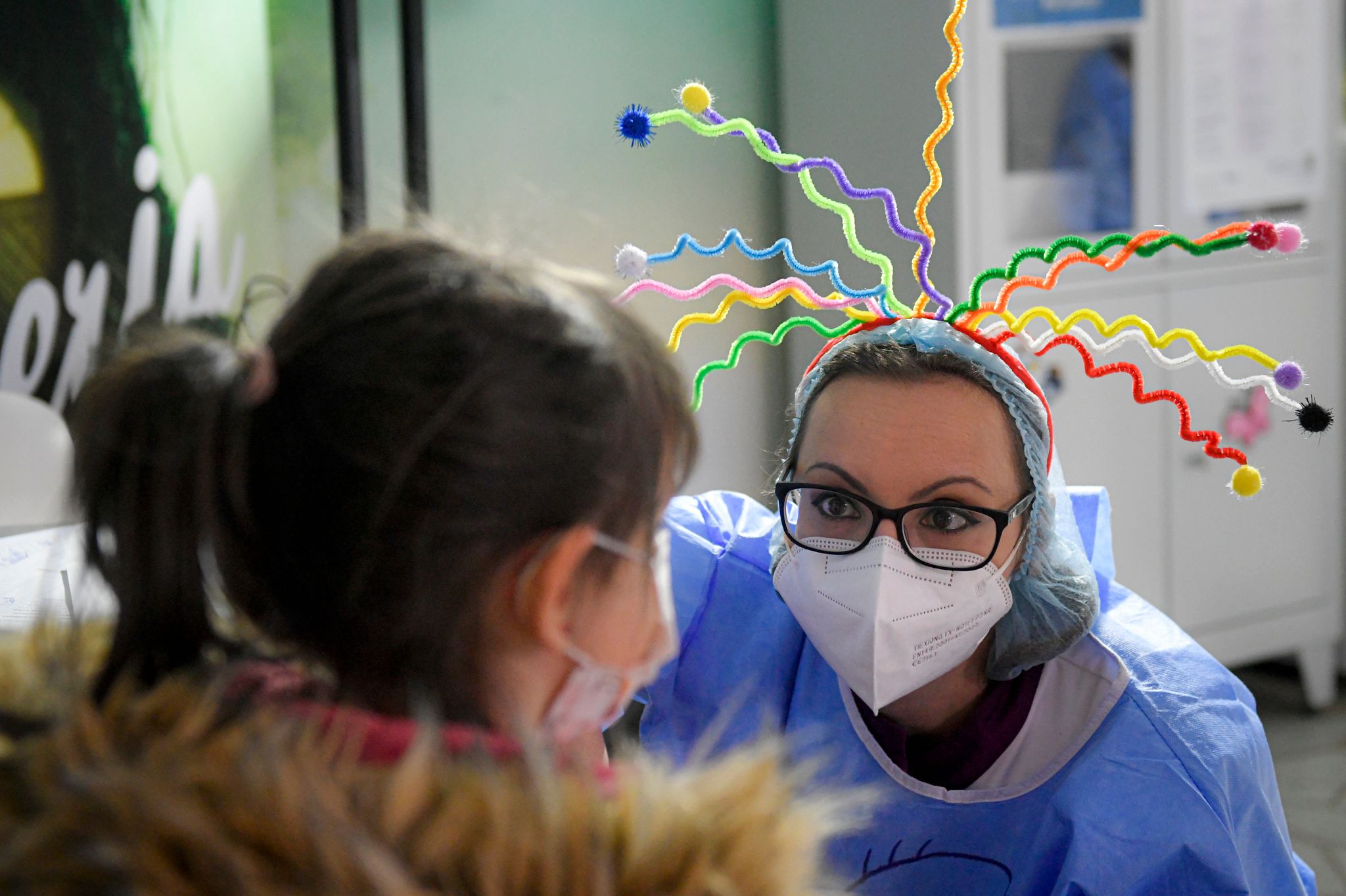 一位醫療人員正試圖緩解小女孩緊張的情緒,這位小女孩將接種她人生的第一劑輝瑞疫苗。圖攝於2022年1月26日羅馬尼亞(Romania)。