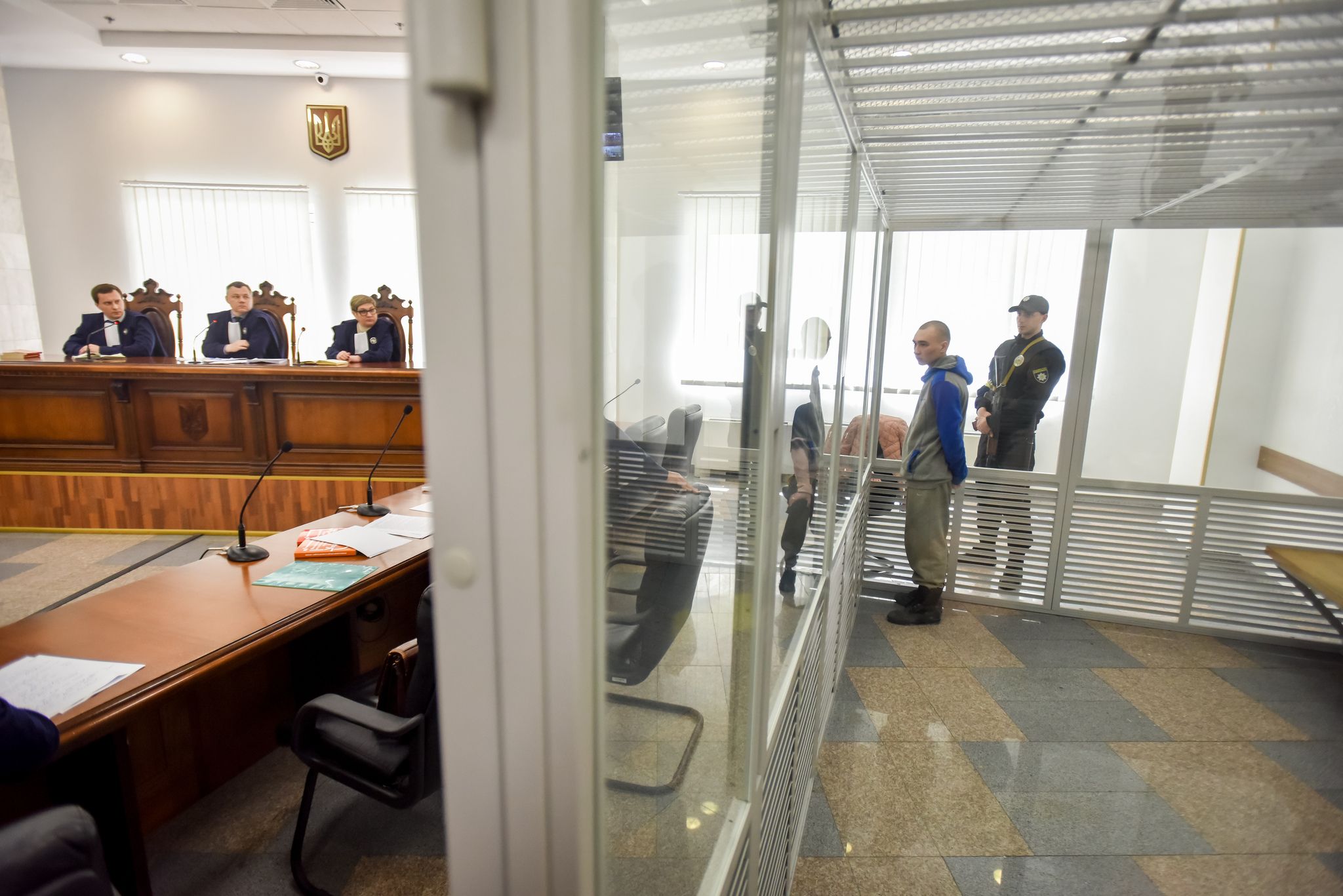 烏克蘭對俄羅斯入侵舉行了第一宗戰爭罪的審理,由3位法官進行審判,俄羅斯士兵希希馬林在強化玻璃後方的被告席聽取整個訴訟過程。圖攝於2022年5月19日。