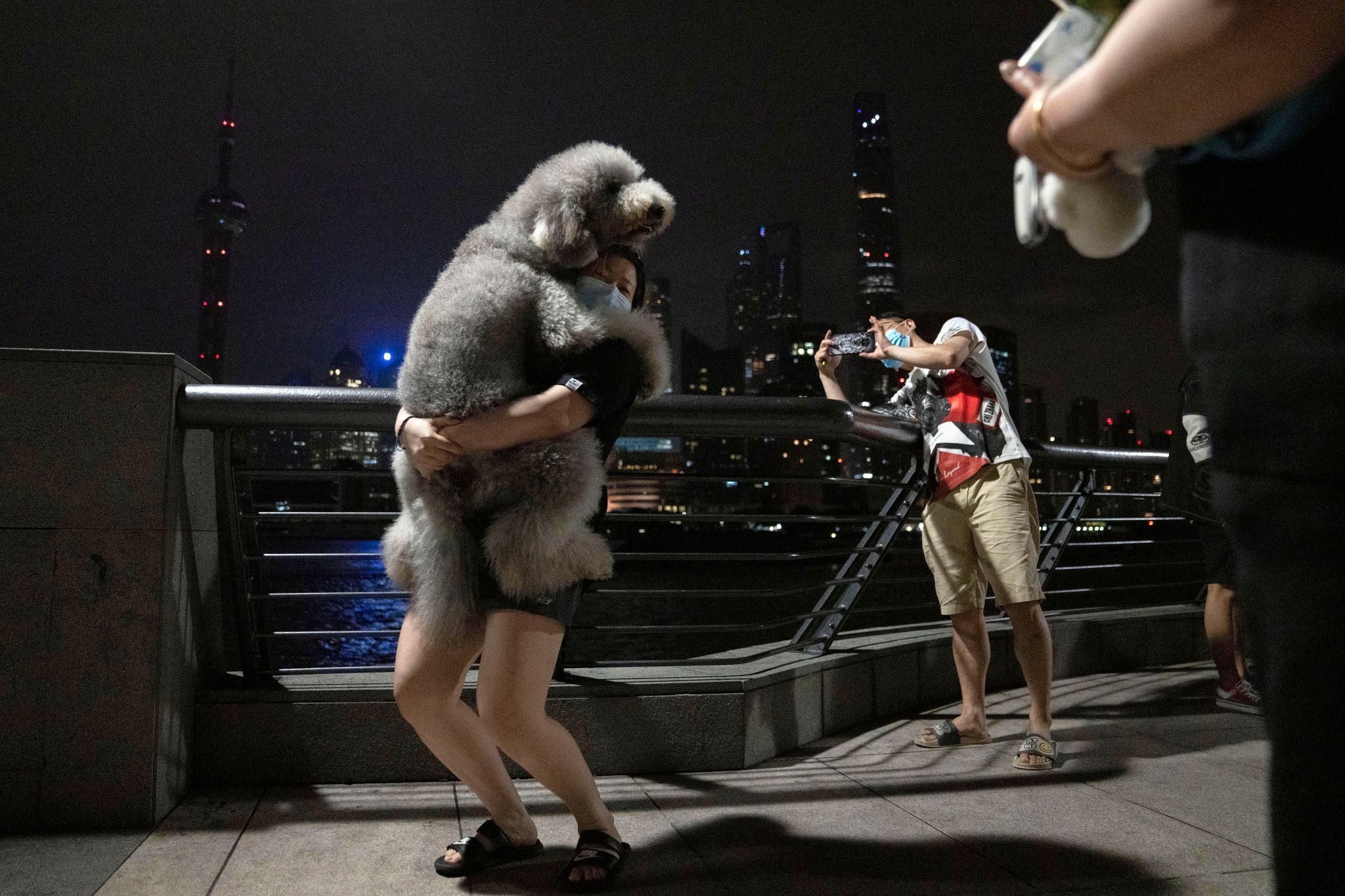 圖攝於5月31日上海,一名女子在接近6月1日零時抱起她養的狗拍照留念,慶祝上海終於解封。
