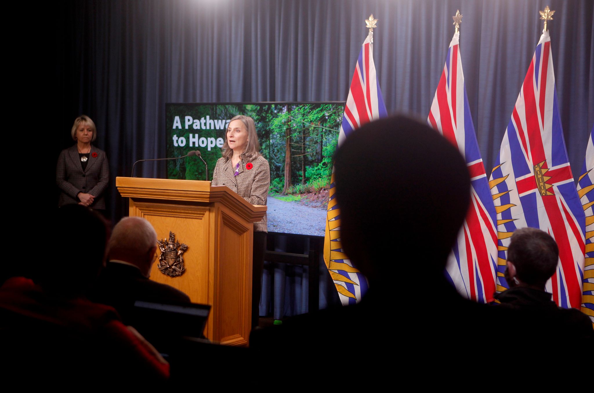 圖攝於2021年11月,加拿大衛生部官員亨利在卑詩省議會大廈(Legislative Assembly of British Columbia)報告,將向加拿大政府申請卑詩省的毒品除罪化。