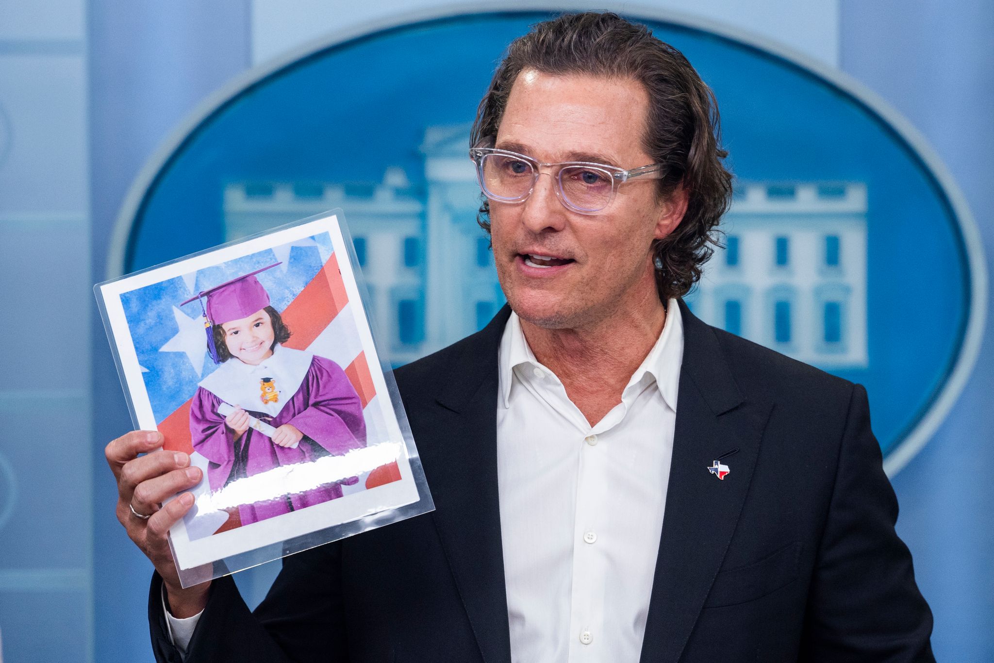 好萊塢演員馬修‧麥康納(Matthew McConaughey)拿著德州尤瓦爾迪小學(Uvalde)槍擊案受害者的遺照,在白宮記者會上呼籲各方看重在使用槍枝時應伴隨的責任。圖攝於2022年6月7日。
