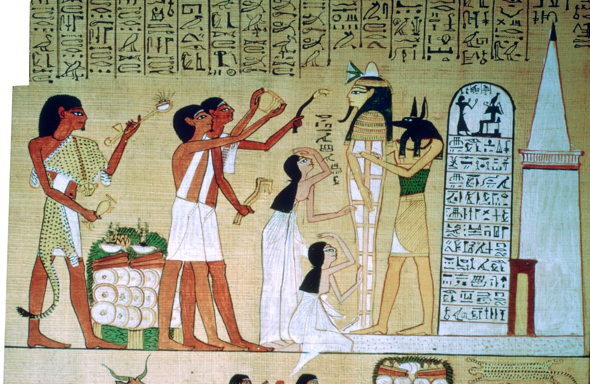 圖為大英博物館(British Museum)保存的《死者之書》(Book of the Dead),內容描述大約在西元前1300年,埃及第十九王朝的一名抄書官員胡內弗爾(Hunefer)死後製成木乃伊的埋葬儀式。圖中左方的祭司正在舉行重要的「開口儀式」(Opening of the Mouth),幫助死者通往永生。