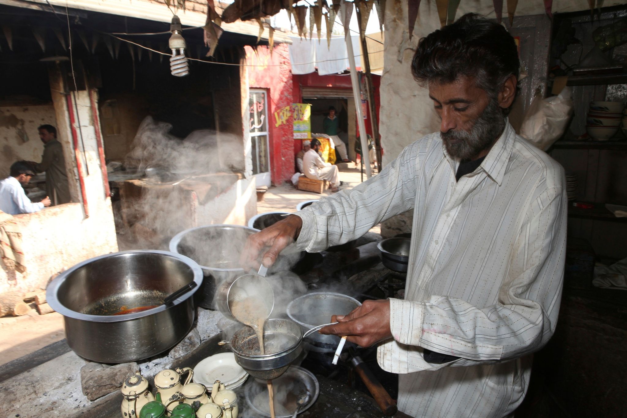 圖為首都伊斯蘭瑪巴德的市集小販,手裡叼著一根菸替客人倒茶。圖攝於2009年。