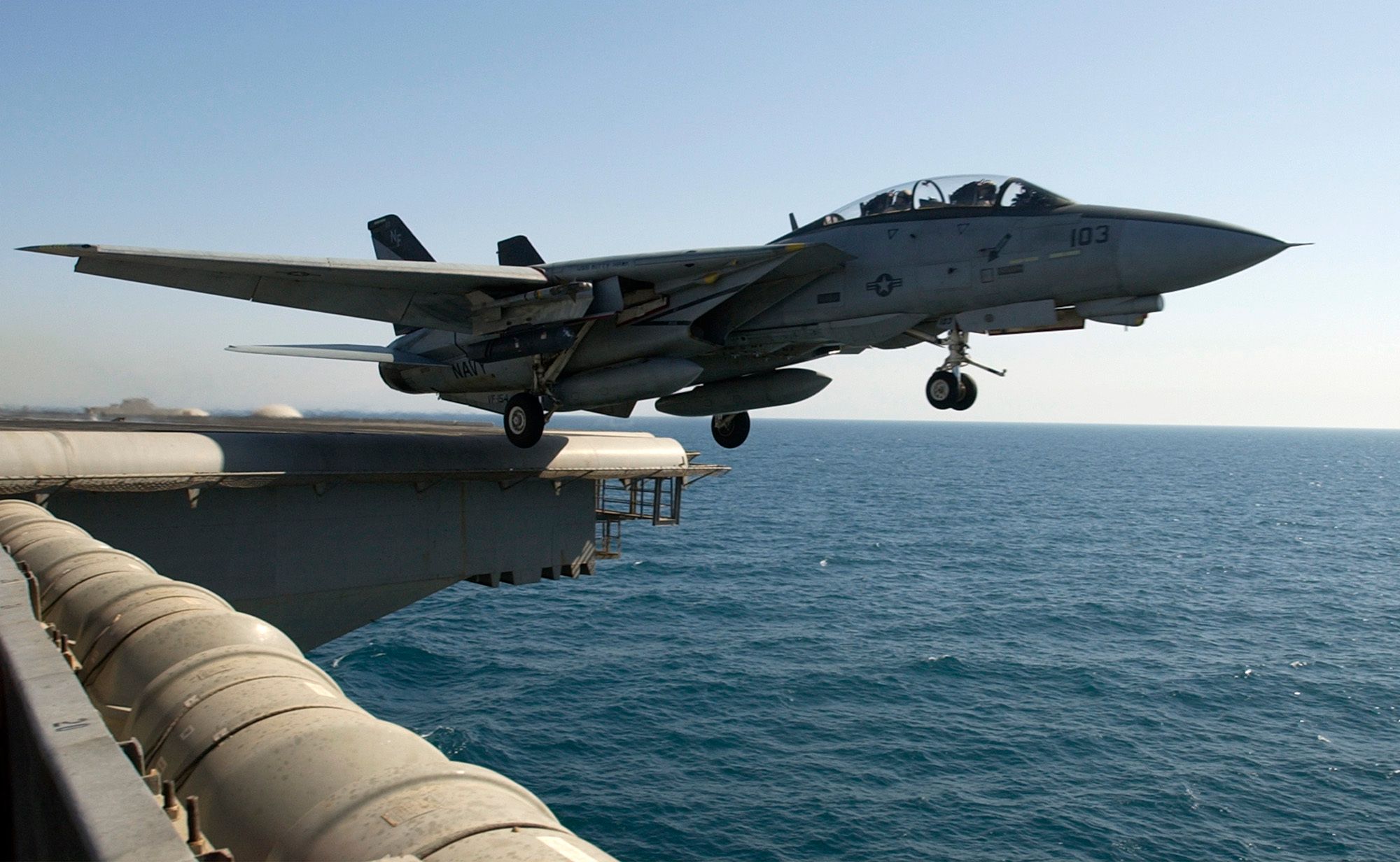 圖攝於2003年4月,伊拉克戰爭期間,一架F-14雄貓式戰鬥機從美國小鷹號航空母艦(USS Kitty Hawk)上起飛。