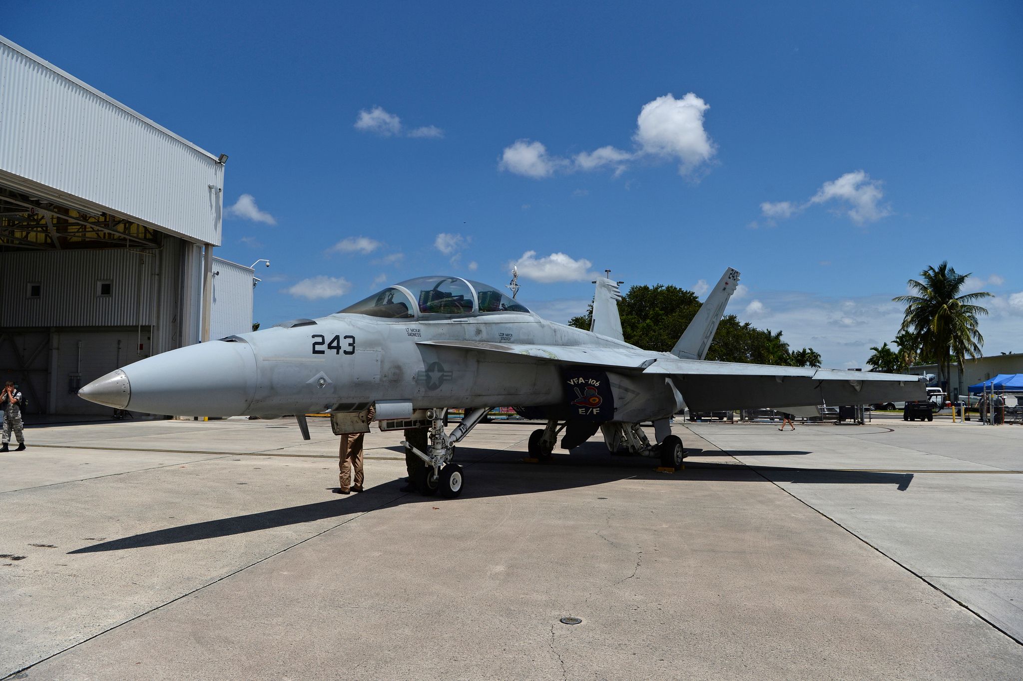 圖攝於2022年5月。F/A-18E/F超級大黃蜂戰機展示於美國2022年邁阿密現代汽車海灘航空展(Hyundai Air & Sea Show)。