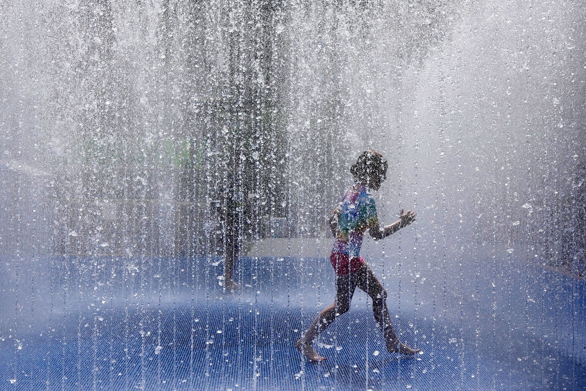 圖攝於2022年6月17日,一名小孩在倫敦的大型噴泉中戲水。近期,英國倫敦遇到熱浪,白天溫度罕見攀升至攝氏30度以上,刷新高溫紀錄。