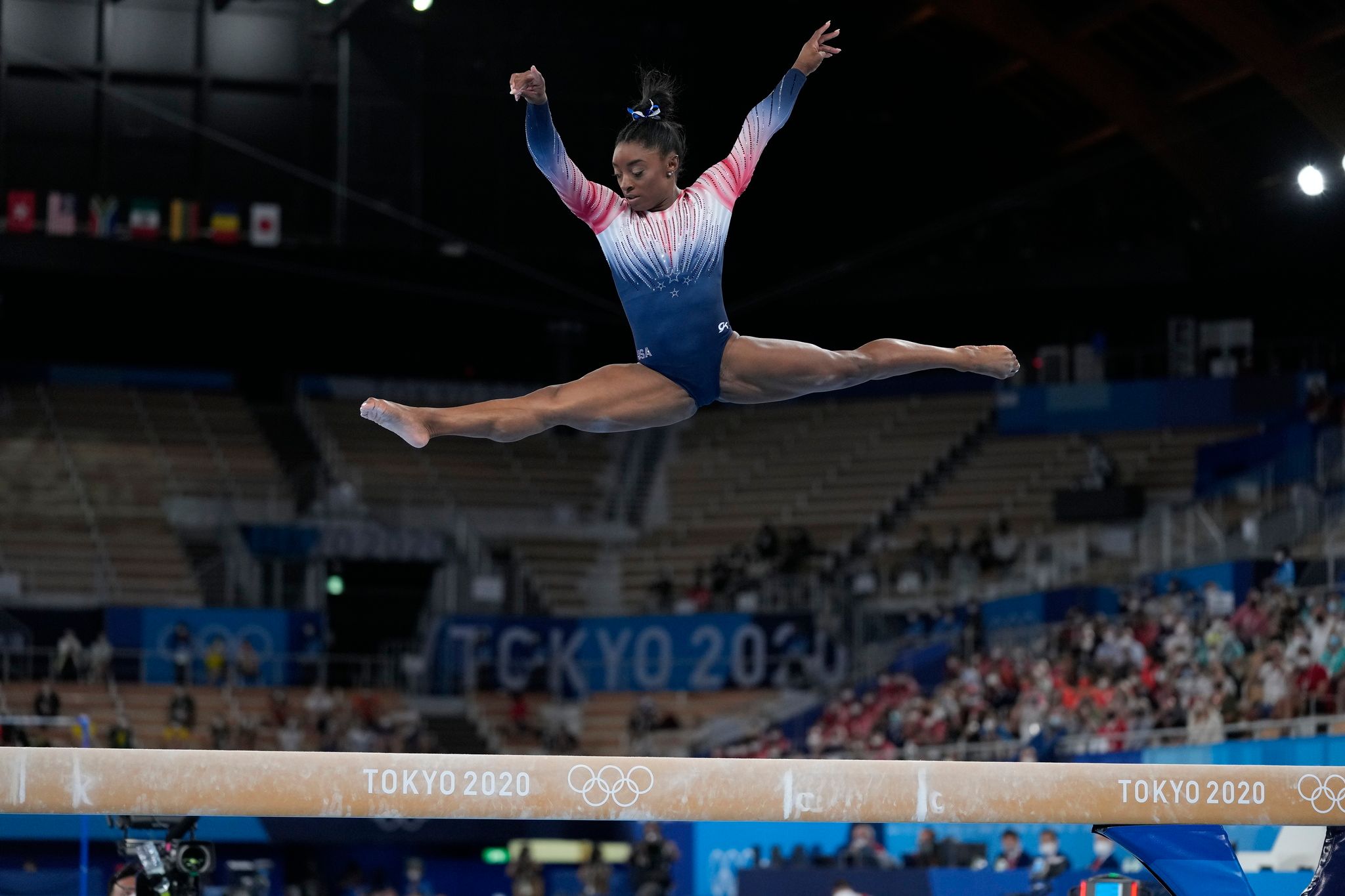美國體操選手Simone Biles在東京奧運中跳馬項目發生嚴重失誤,之後便以心理健康因素為由退出東京奧運會體操女子團體和個人全能比賽。圖為她參加東奧女子體操平衡木項目。