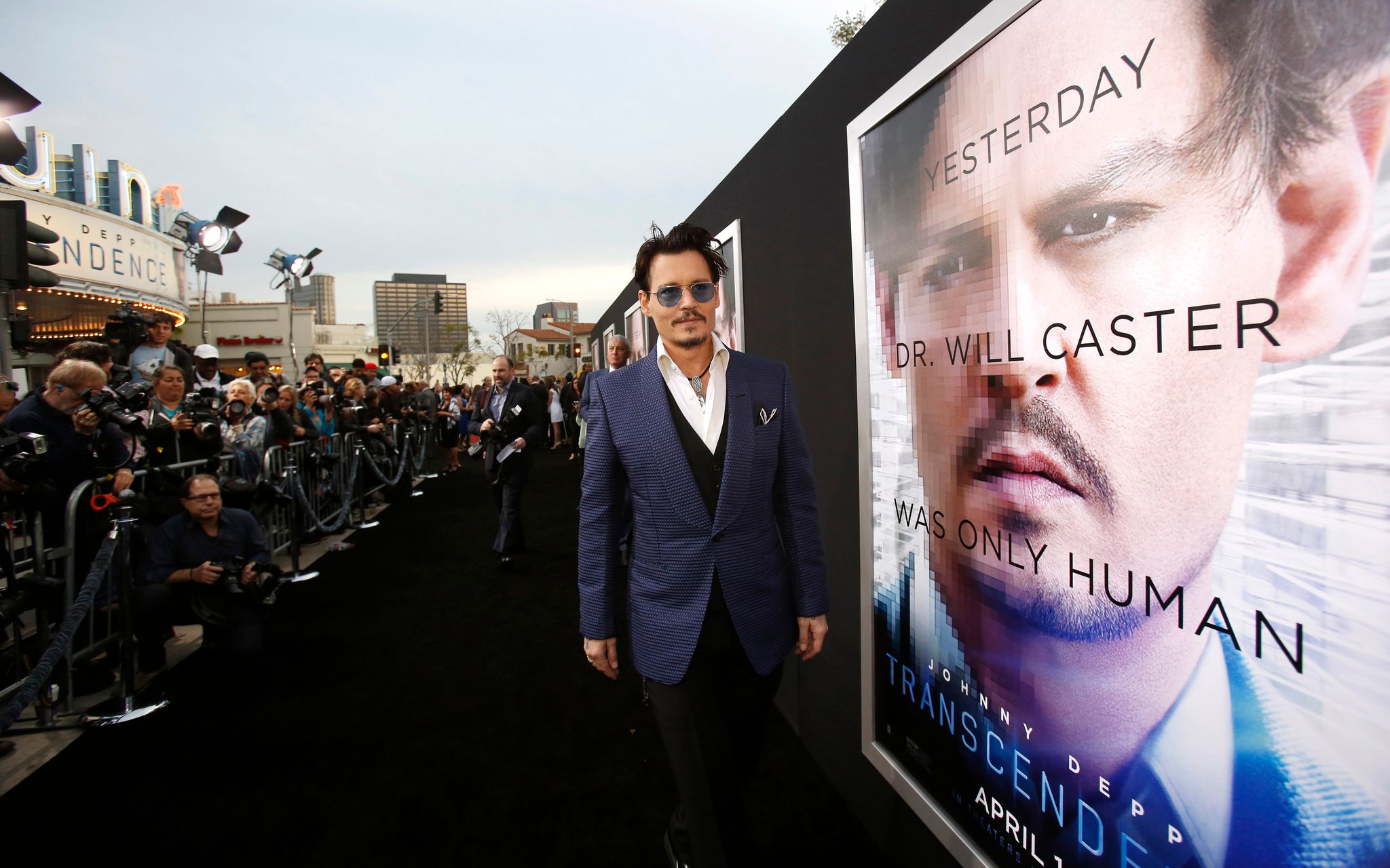 圖為電影《全面進化》(Transcendence)於2014年上映時,在加州洛杉磯舉行首映,擔任主演的好萊塢演員強尼戴普(Johnny Depp)出席首映典禮。電影描述強尼戴普飾演的人工智慧科學家在肉體死亡前,將大腦與人工智慧連接上,上傳至網路,並以這個力量支配了世界。
